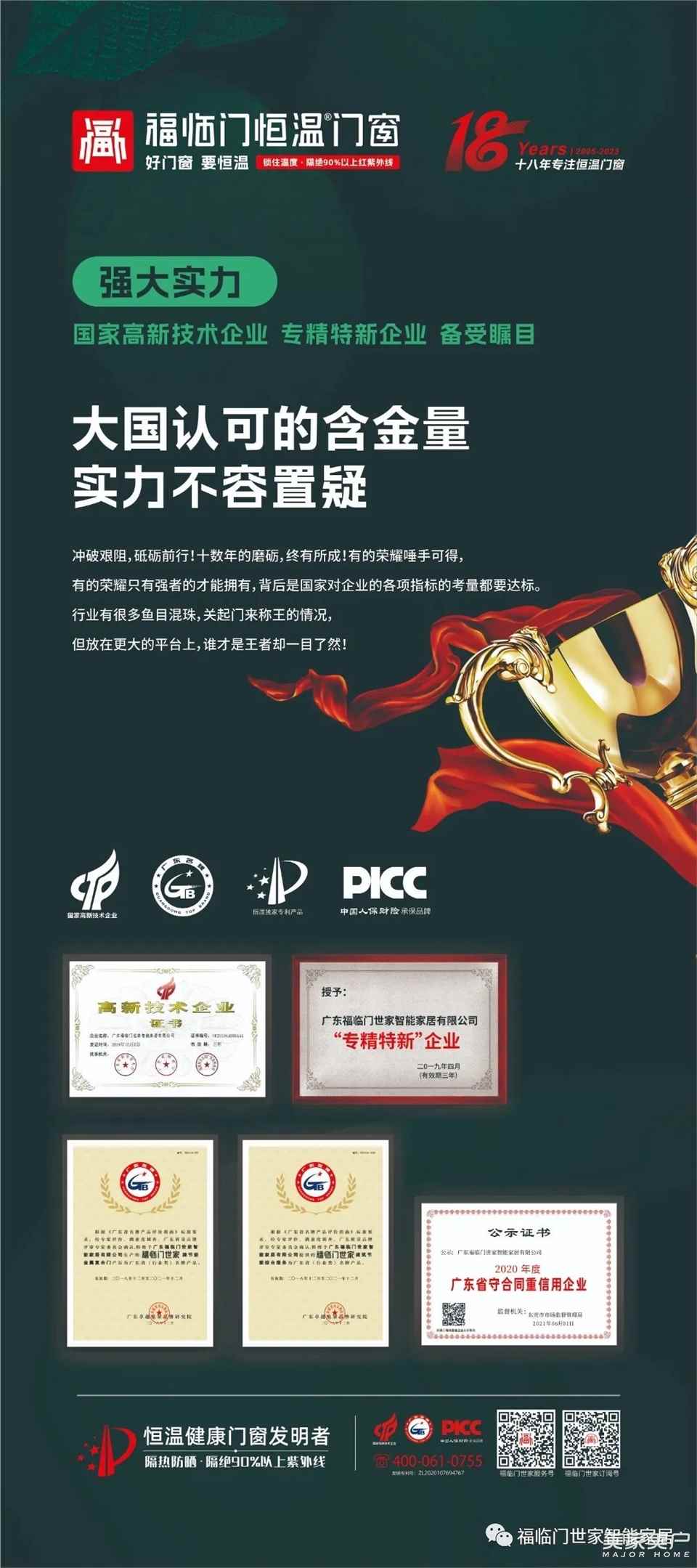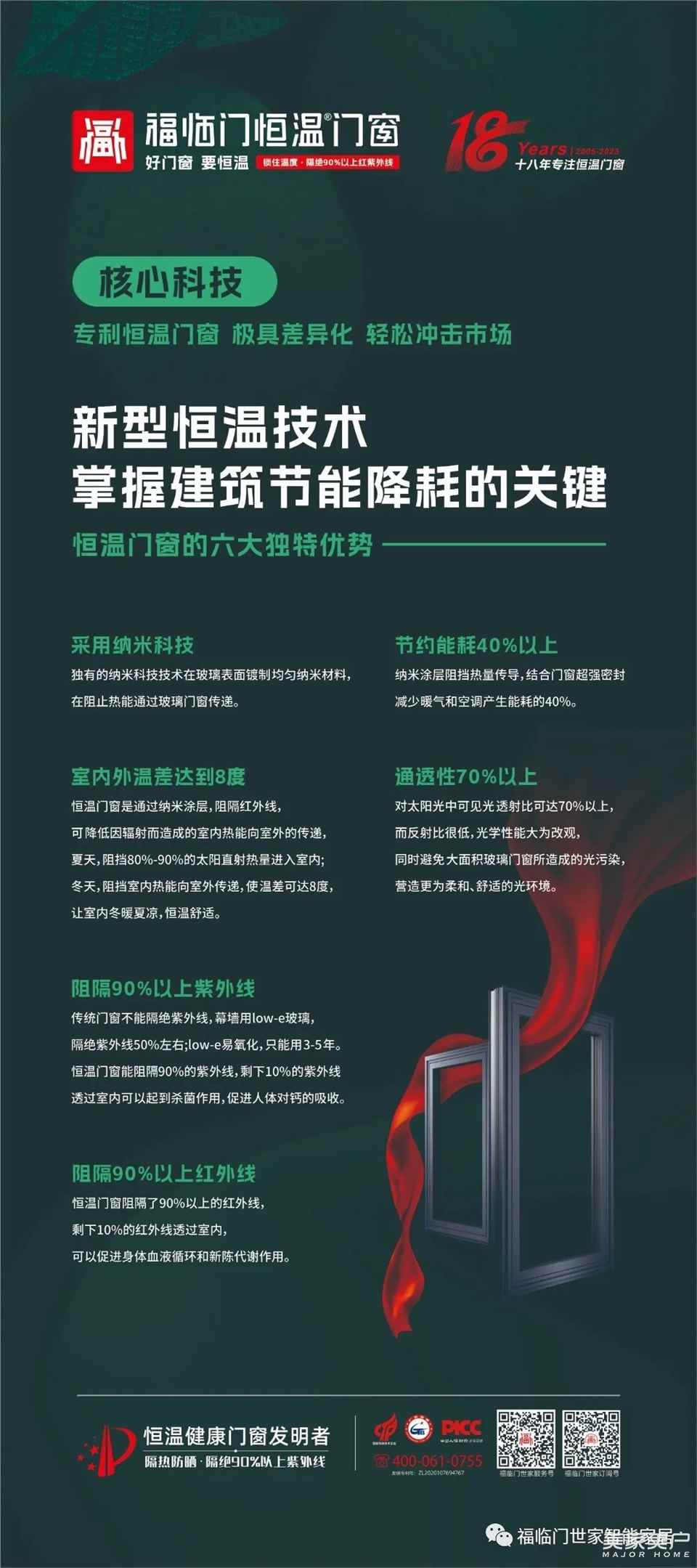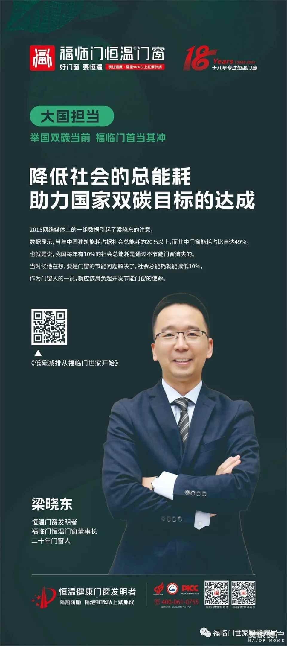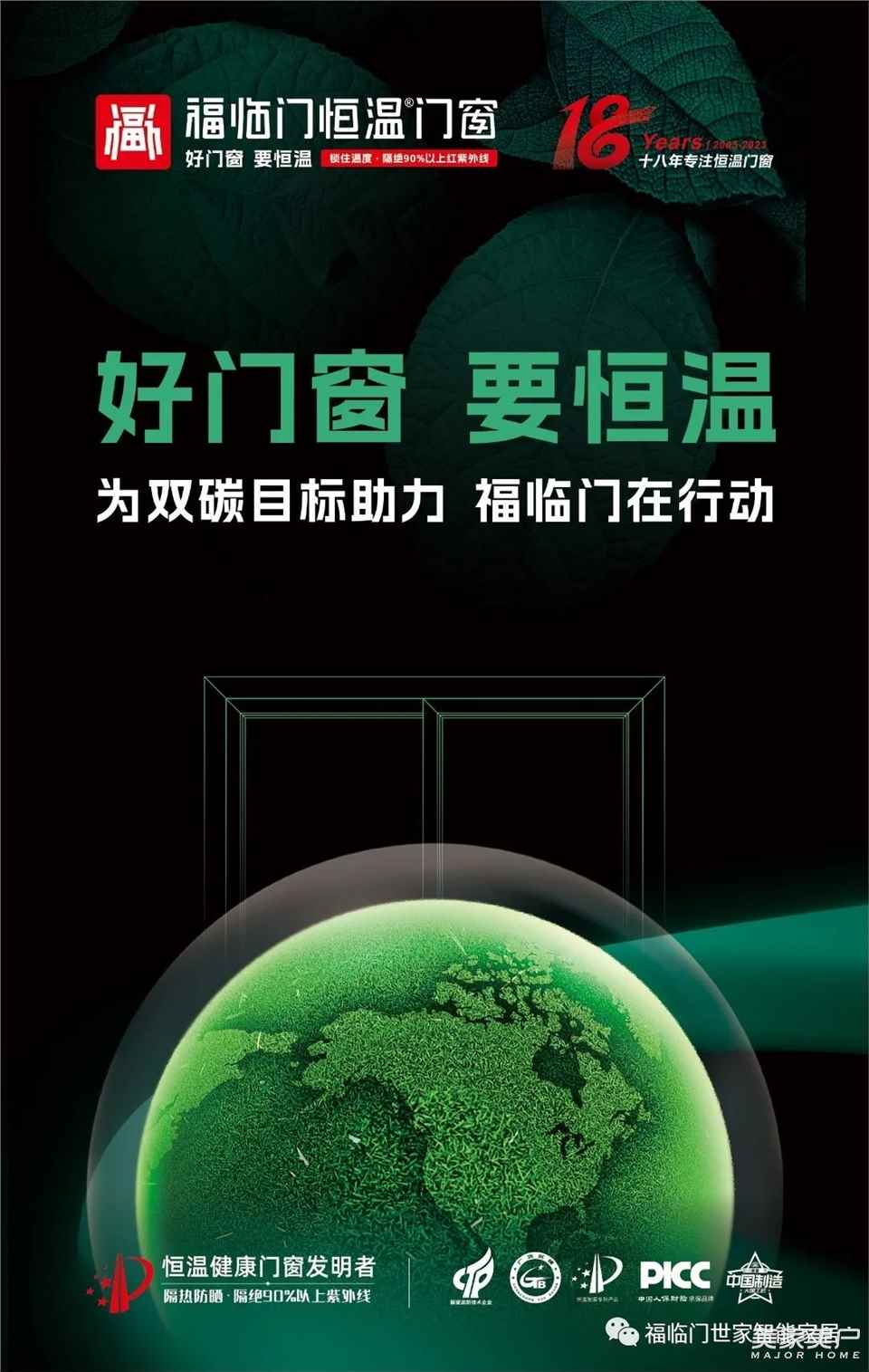 福临门恒温门窗符合习总书记的“两山理论(金山银山就是绿水青山)”,符合国家碳2030年达峰、2060年碳中和的国家大势,是与国、与民、与消费者、与经销商、与厂家,多方共赢的新赛道,是“功在当代,利在千秋”的可以为之奋斗终生的伟大事业!
