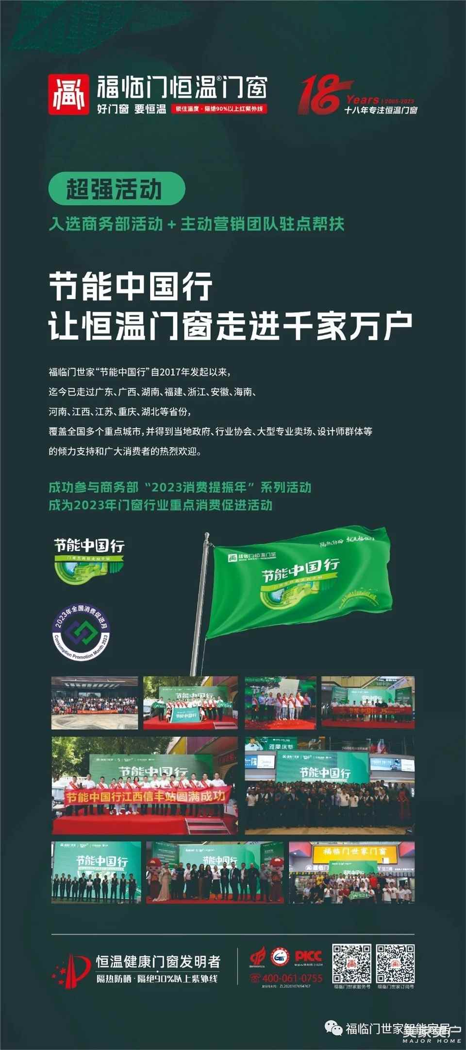 福临门恒温门窗”节能中国行“,成功参与商务部”2023消费提振年“系列活动。福临门恒温门窗在激烈竞争的门窗红海里面,开辟了一条全新的赛道,打造了门窗的新品类,差异化产品让我们可以避开价格战,让竞争对手很难抢走我们的订单。