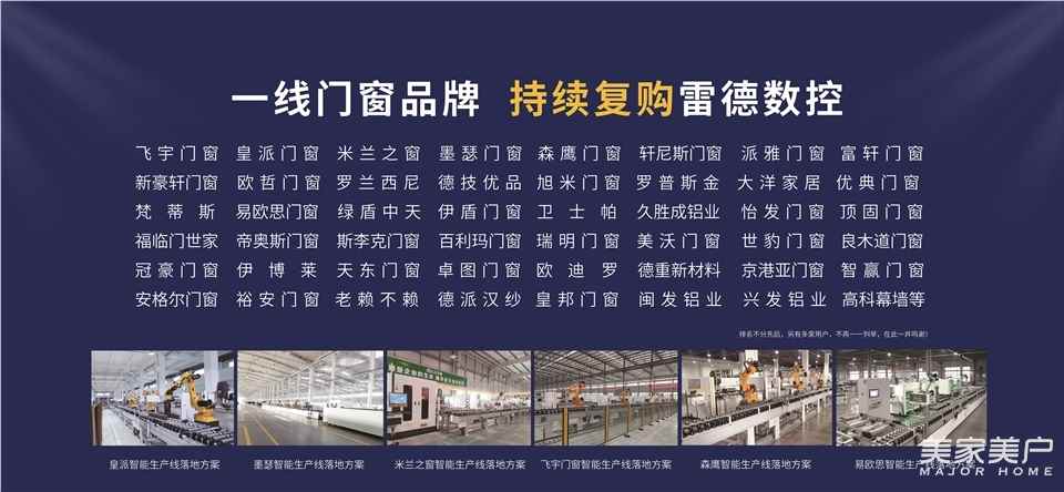 雷德数控领先的智能设备,广受门窗企业的好评和认可。截止到目前,知名门窗企业均已成为雷德数控的战略合作伙伴,如派雅门窗、新豪轩门窗、皇派门窗、轩尼斯门窗、飞宇门窗、米兰之窗、墨瑟门窗、森鹰门窗等。从2020-2022年,雷德数控在家装门窗智能生产线连续三年全国销量第一。