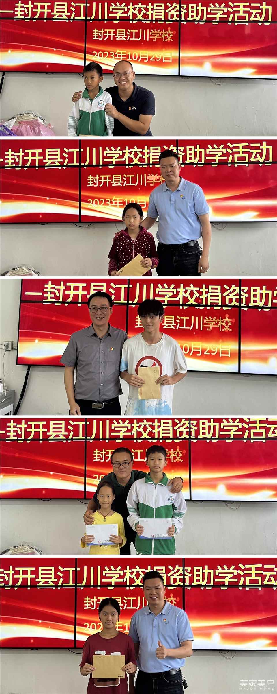以善心汇聚力量,用善行温暖人心,10月29日,在广东省门业协会会长、派雅门窗董事长李钧洪,广东省门业协会执行会长徐生,广东省门业协会党支部书记、佛山南狮救援队队长马建华带领下,广东省门业协会党支部成员、入党积极分子、派雅门窗、东亚门业、卡得罗门窗、金羊门业、瑞达佰邦、膜先生、粤莱美、盛锋五金、天辰股份和其高门窗五金家10家会员企业,再次走进肇庆市封开县江川学校,对该校16名困难学生进行结对助学活动。这是继8月31日广东省门业协会党支部与南狮救援队党支部联合在江川学校开展助学活动后,更大一次捐资助学活动。本次活动受到江川镇镇政府和江川学校的热烈欢迎和大力支持,江川镇驻镇书记邱将军、黎壬清,江川镇镇委员、江川学校校长苏瑞彬、副校长莫增和,及师生代表和受捐学生家长出席了本次活动。