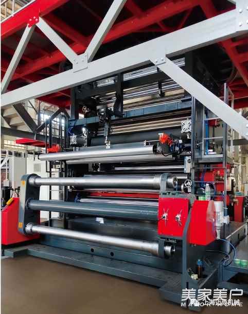 说实话在之前还真不知道制膜的生产线设备是挤压成膜吹塑流平成卷是必须有下往上的流水生产线,产线高度有十几米高,如此也非一般工厂和厂房可以正常容纳的。在成膜后道可以制作成对折膜等,对于客户不同的选择可以分卷成不同宽度的膜卷。关键的核心要素是原材料为进口这样保证了热缩膜的稳定和收缩率的均匀性。