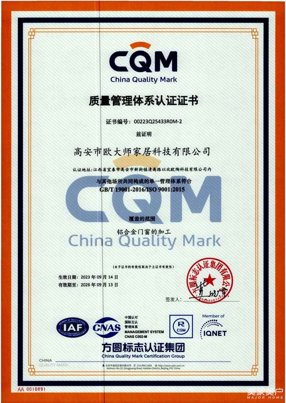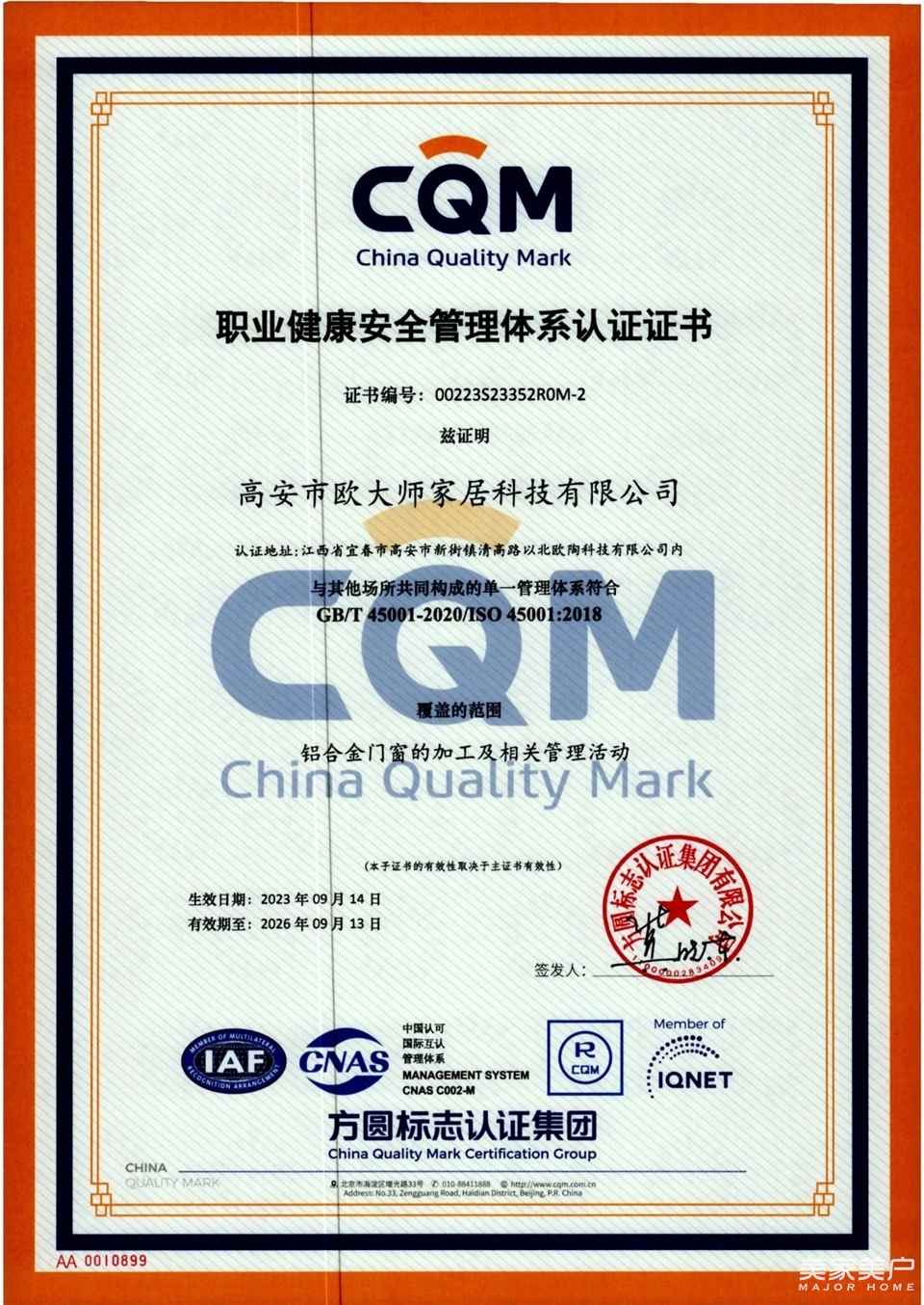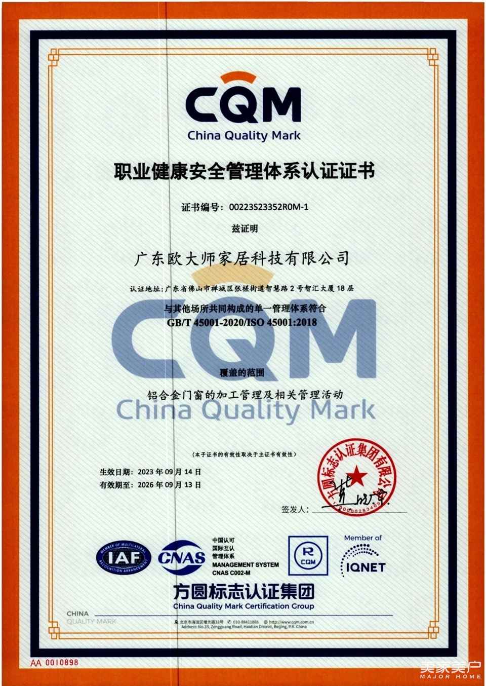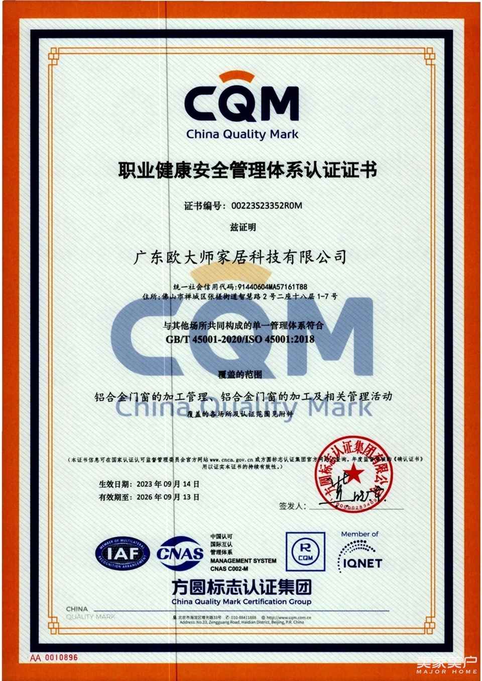 喜讯不断、捷报频传。经国家权威机构的认证与审核,近日欧大师隔热门窗顺利通过ISO9001质量管理体系、ISO14001环境管理体系、ISO45001职业健康安全管理体系三大认证,取得《质量管理体系认证证书》《环境管理体系认证证书》《职业健康安全管理体系认证证书》;