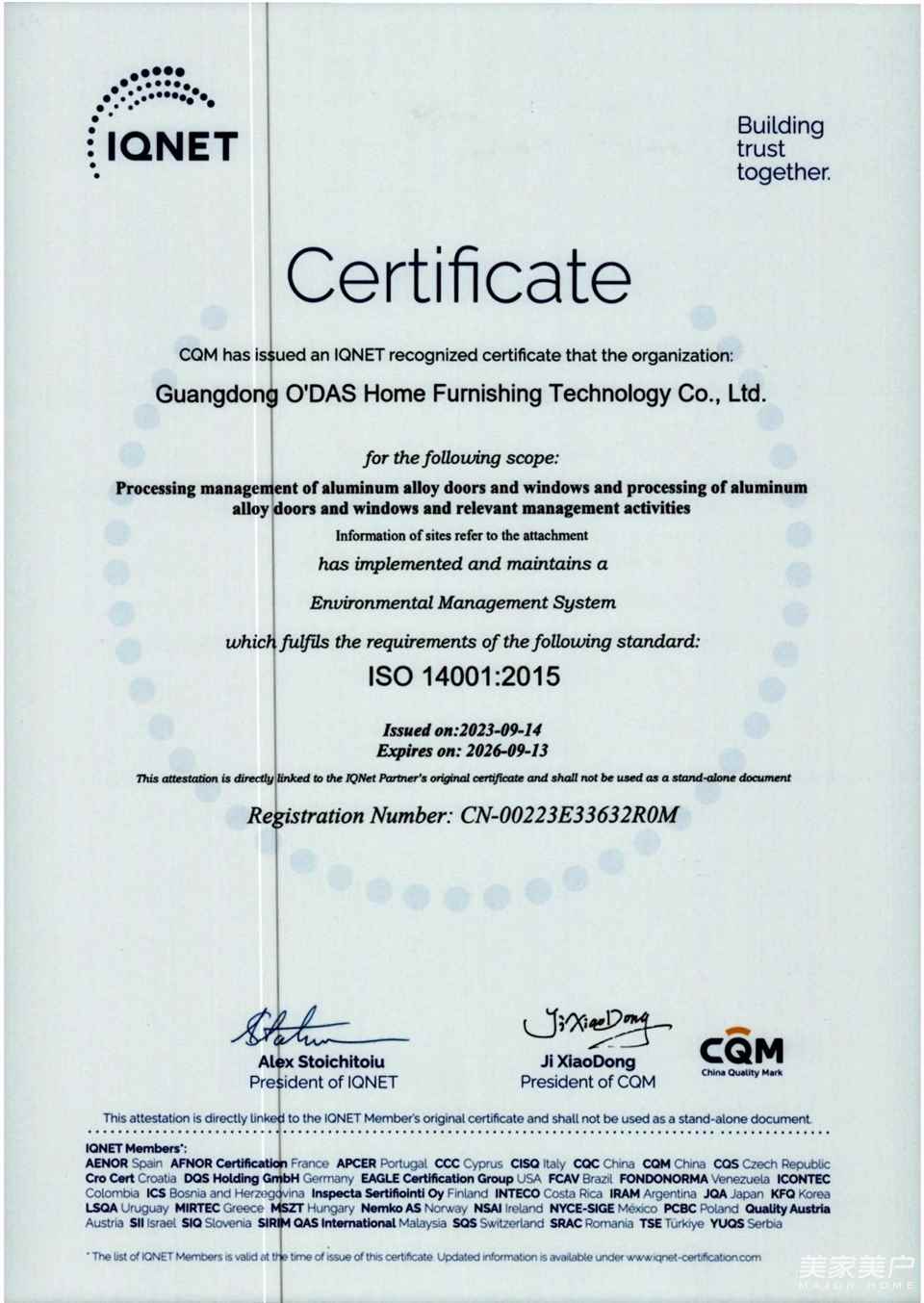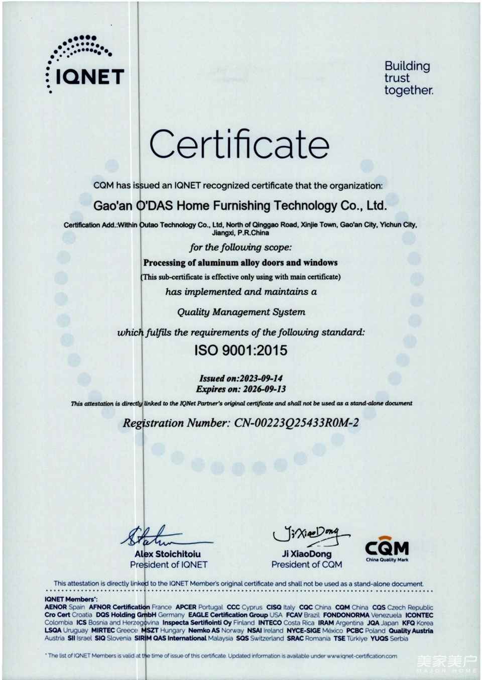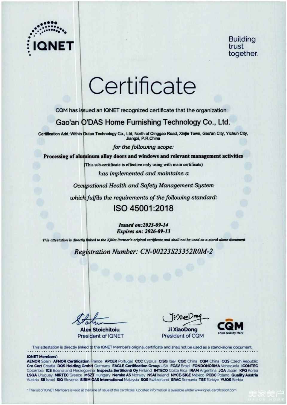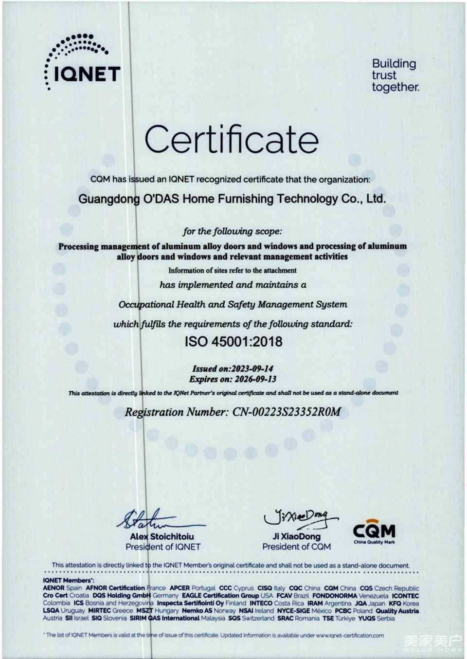 喜讯不断、捷报频传。经国家权威机构的认证与审核,近日欧大师隔热门窗顺利通过ISO9001质量管理体系、ISO14001环境管理体系、ISO45001职业健康安全管理体系三大认证,取得《质量管理体系认证证书》《环境管理体系认证证书》《职业健康安全管理体系认证证书》;
