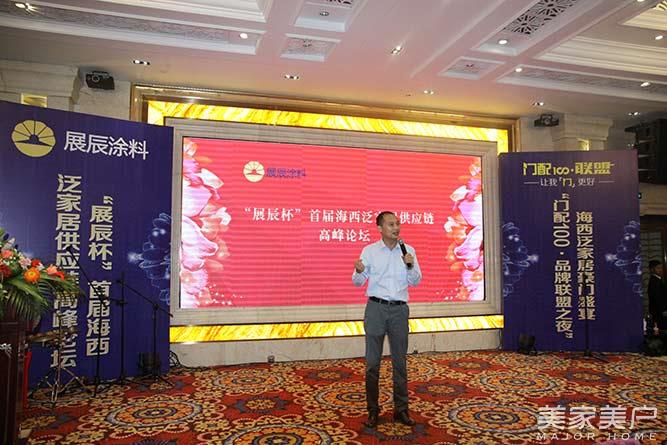 在“展辰杯”首届海西泛家居供应链高峰论坛环节中,福州展辰新材料有限公司项目经理陈传印作了《近“水”家具先得月—定制家具行业油转水经验分享》的专题演讲。门配100?品牌联盟董事长周文华在会上与泛家居企业家分享了《门配100?品牌联盟发展之路与门配100平台如何提升行业价值》的演讲。金田豪迈木业机械有限公司营业经理张椿祥作了《定制家具自动化涂装设备的运营(既如何实现油转水)》的演讲。中山市欧派克五金制品有限公司项目经理邱为政作了《小滑轮,大世界》的演讲。建设银行厦门分行小企业业务部总经理戴维弘推介了深受中小企业关注的金融系列产品。