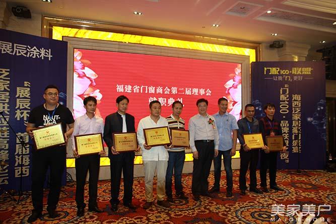 随后,举行了门配100?品牌联盟之夜—福建省门窗商会第二届理事会就职典礼、福建省定制家居行业协会第一届理事会就职典礼晚宴盛典。在福建省门窗商会第二届理事会就职典礼上,福建省工商联会员部部长郑玉明宣布当选会长、监事长、常务副会长、副会长、秘书长名单;郑玉明为肖文哲授予福建省门窗商会第二届理事会会长单位牌匾,为陈清河授予福建省门窗商会第二届监事会监事长单位牌匾。同时,张国林、肖文哲、陈清河分别为当选福建省门窗商会第二届理事会常务副会长、副会长、常务理事、理事、监事进行了授牌。