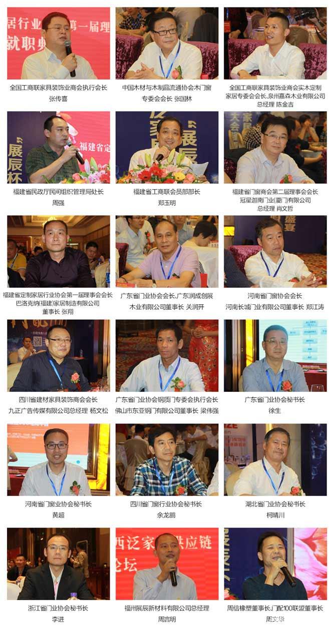 全国工商联家具装饰业商会执行会长张传喜,中国木材与木制品流通协会木门窗专委会会长张国林,福建省工商业联合会会员部部长郑玉明,福建省民政厅民间组织管理局周强处长,厦门市工商联(总商会)党组书记王沁,原厦门市人大常委会副主任、厦门市仲裁委员会主任汪兴裕,厦门市总商会专职副主席董仁生,厦门市同安工业集中区管委会常务副主任陈再进,厦门市同安工业集中区管委办郭勋毅,厦门经济管理学院副院长王金杯,河南省洛宁县工会主席张清涛,以及全国工商联家具装饰业商会橱柜专委会会长、厦门金牌橱柜股份有限公司总经理潘孝贞,全国工商联家具装饰业商会实木定制家居专委会会长、泉州嘉森木业有限公司总经理陈金吉,福建省门窗商会第二届理事会会长(新当选)、冠星迦南门业(厦门)有限公司总经理肖文哲,福建省定制家居行业协会第一届理事会会长(新当选)、巴洛克纳(福建)家居制造有限公司董事长张翔,全国工商联家具装饰业商会副秘书长李博维,福建省闽商资本联合会会长苏福伦,闽商地产联盟执行会长、拓界资本董事长林雄,广东省门业协会会长、广东润成创展木业有限公司董事长关润开,广东省门业协会秘书长徐生,河南省门窗协会会长、河南长城门业有限公司董事长郑江涛,云南省门窗协会会长、昆明蓝眉门业有限公司董事长应东福,广西省门窗协会会长、广西广邑门业有限公司董事长覃安勇,四川省建材家具装饰商会会长、九正广告传媒有限公司总经理杨文松,浙江省门业协会秘书长李进,湖北省门业协会秘书长柯晴川,四川省门窗行业协会秘书长余龙鹏,河南省门窗业协会秘书长黄超,山东省家具协会定制家居专委会秘书长徐宝传,厦门市定制家居产业协会会长陈庆龙,广东省门业协会钢质门专委会执行会长、佛山市东亚钢门有限公司董事长梁伟强,门配100品牌联盟董事长周文华,福州展辰新材料有限公司总经理周言明等来自全国各省级门业、定制家居协会相关领导与嘉宾逾500人参加了此次大会。