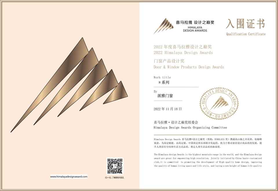 喜马拉雅·设计之巅奖是依托“严谨、公平、公正”为评选理念的全球高端设计和最具影响力的大奖。派雅门窗紧跟消费者需求趋势变化,不断创新“深舒适”品类价值,持续推出性能与美学兼具的高品质门窗,连续两年入围喜马拉雅设计之巅奖。同时,为了更好满足不同用户的不同需求,派雅门窗于行业内创新性打造产品价值矩阵管理,对用户进行细分,构建层级式、矩阵式的4+1产品价值管理体系,从而更好的提升产品认知效率,更好的服务于用户。