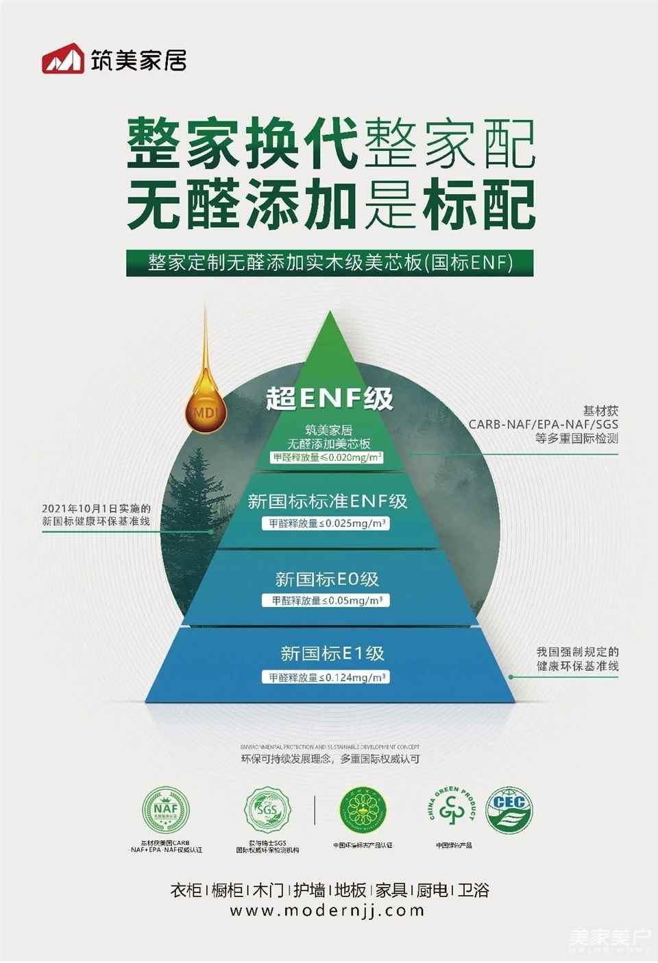 筑美家居始终秉持一丝不苟、精益求精的匠人精神,精心打磨产品细节,不断升级工艺技术,历经上百次的改版、检测和优化,研发推出无醛添加美芯板,其甲醛释放量<0.020mg/m³,比新国标最高标准ENF级(s0025mg/m³)规定的甲醛释放量更低。超ENF级的环保品质,使筑美家居成为600多万个家庭的健康新选择。