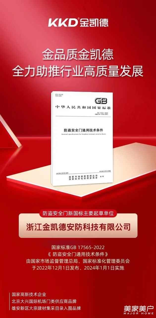 2024年1月1日,GB7565-2022《防盗安全门通用技术条件》新国家标准将开始实施,据了解,此国家强制标准是在GB 17565-2007标准上修订而成,主要起草单位为国家安全防范报警系统产品质量监督检验中心(北京)、公安部第三研究所、国家安全防范报警系统产品质量监督检验中心(上海)、中国建筑金属结构协会及浙江金凯德安防科技有限公司等安全门锁企业。