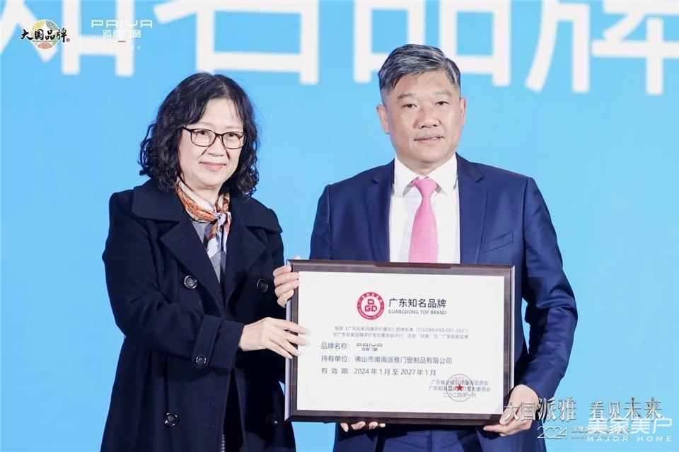 活动现场,广东工业大学管理学院教授、粤港澳大湾区品牌战略研究中心首席专家、广东省企业品牌建设促进会研究院副院长、广东知名品牌评委会副主任冯冈平莅临现场为派雅门窗董事长李钧洪进行“广东知名品牌”授牌。