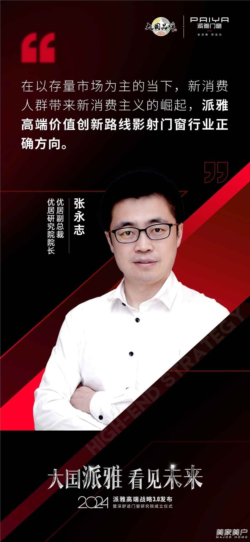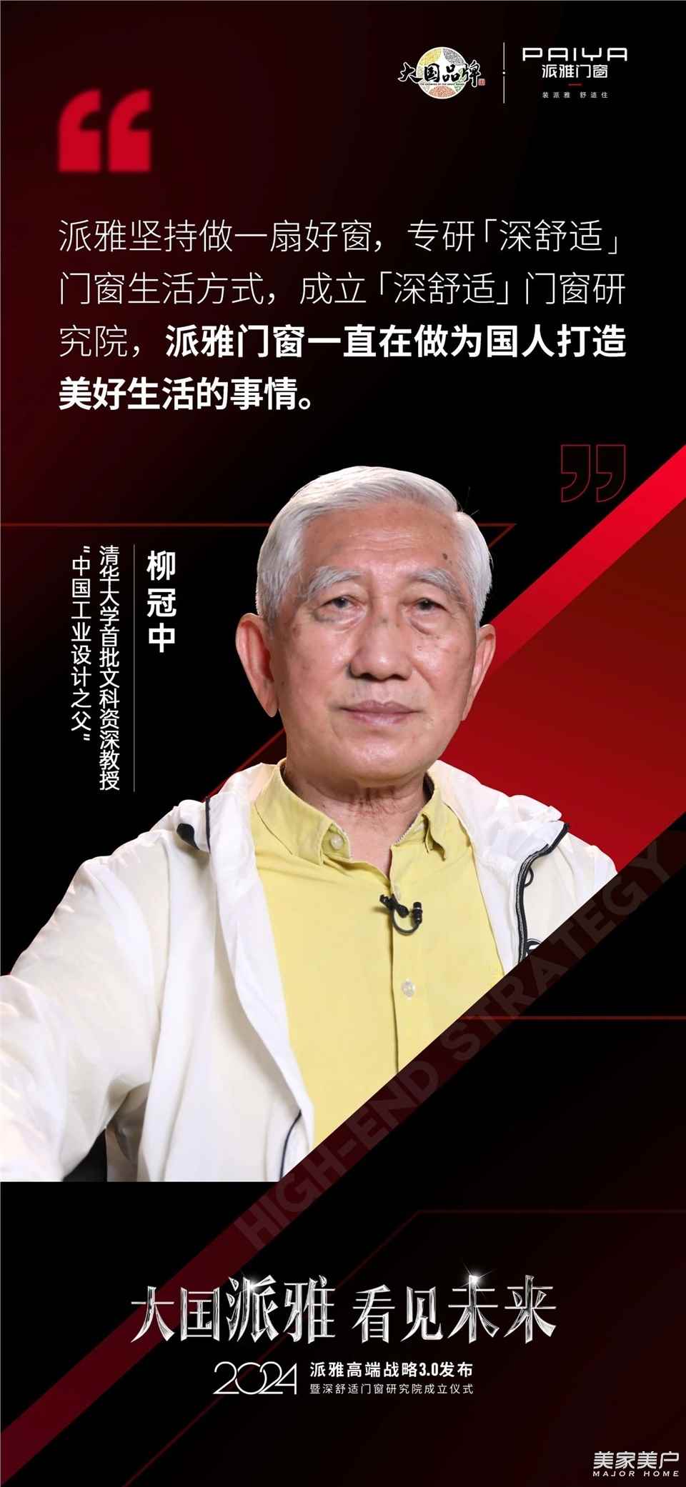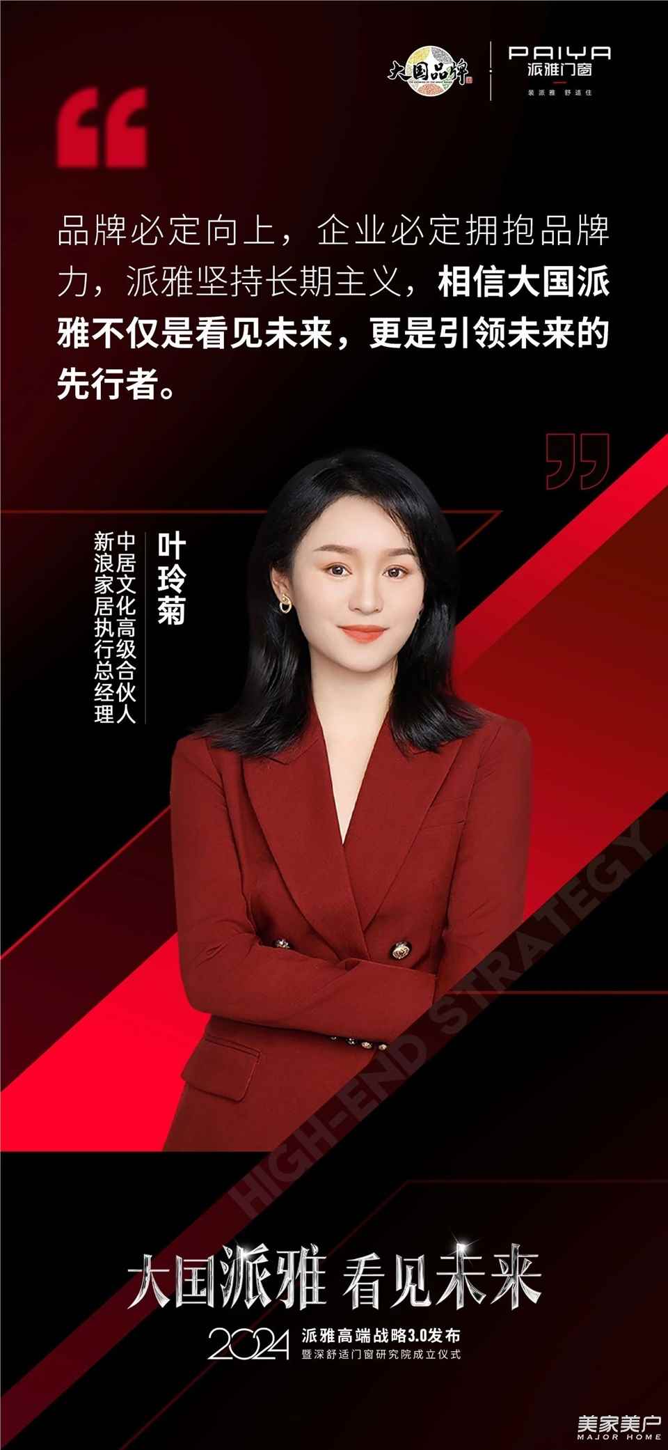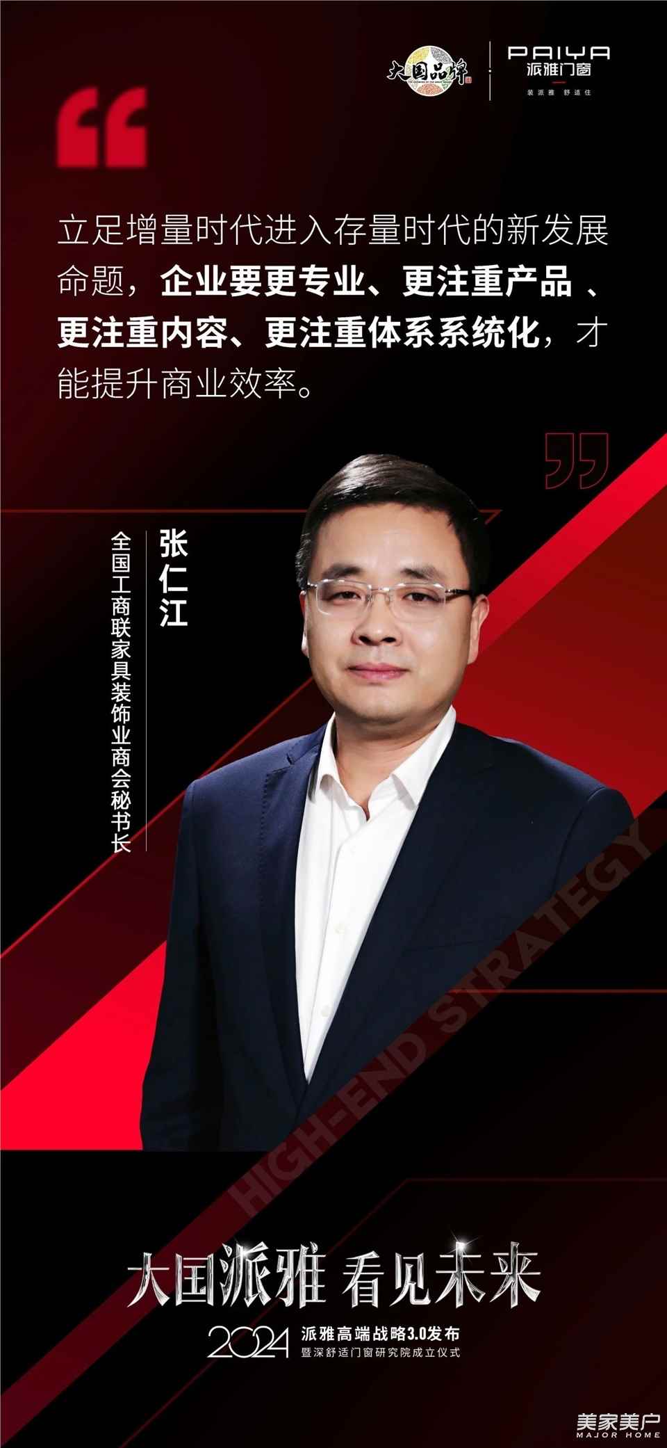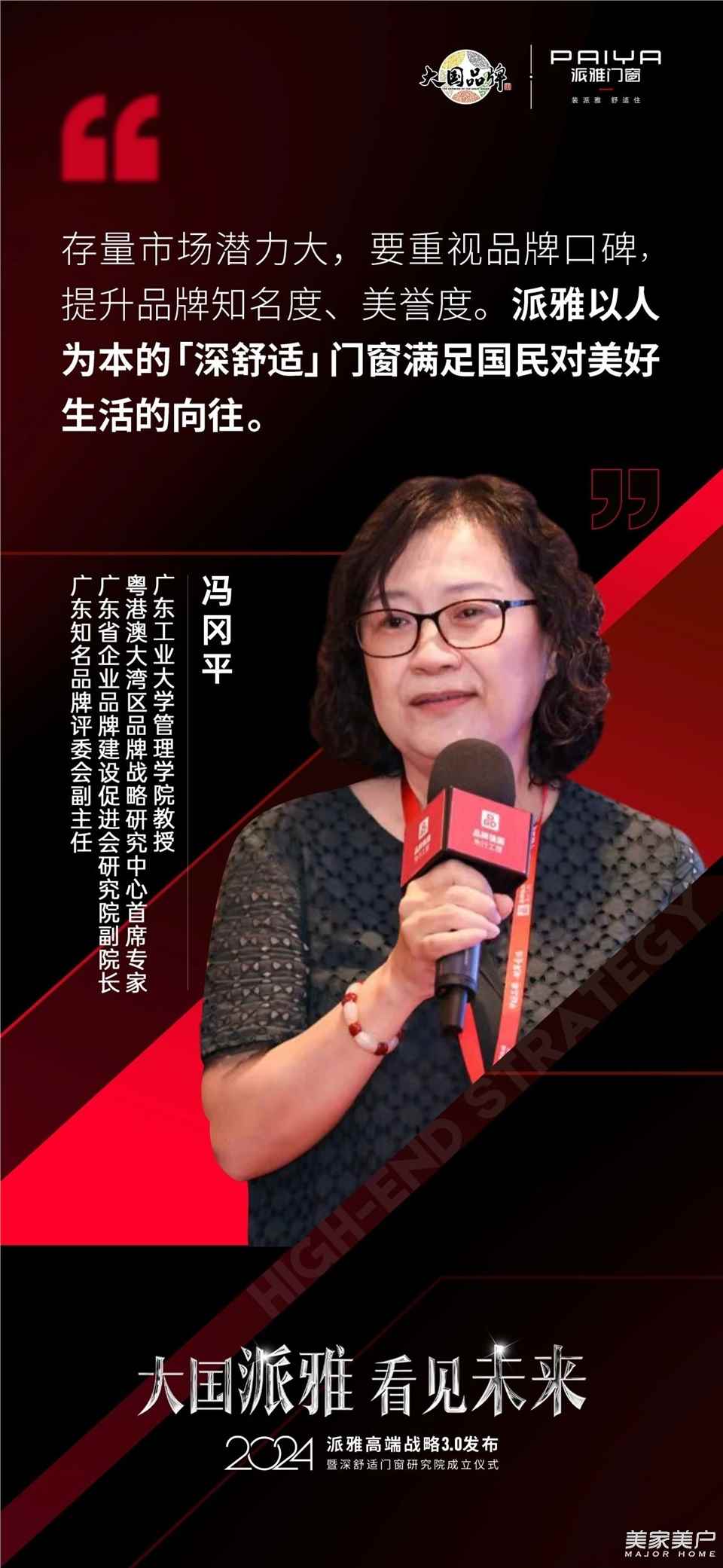 广东省家居业联合会执行主席蒋德辉表示:2023年,企业在价格战和价值战之间拉锯,派雅门窗坚定以“价值”为方向,并取得杰出成绩,让我们看到了派雅作为行业旗帜的引领作用。2024年,各行各业都处于理性回归状态,企业想要获得更好的成绩就应该坚守产品力为核心,不断夯实企业品牌力,实现以优秀产品和服务力打动消费者。