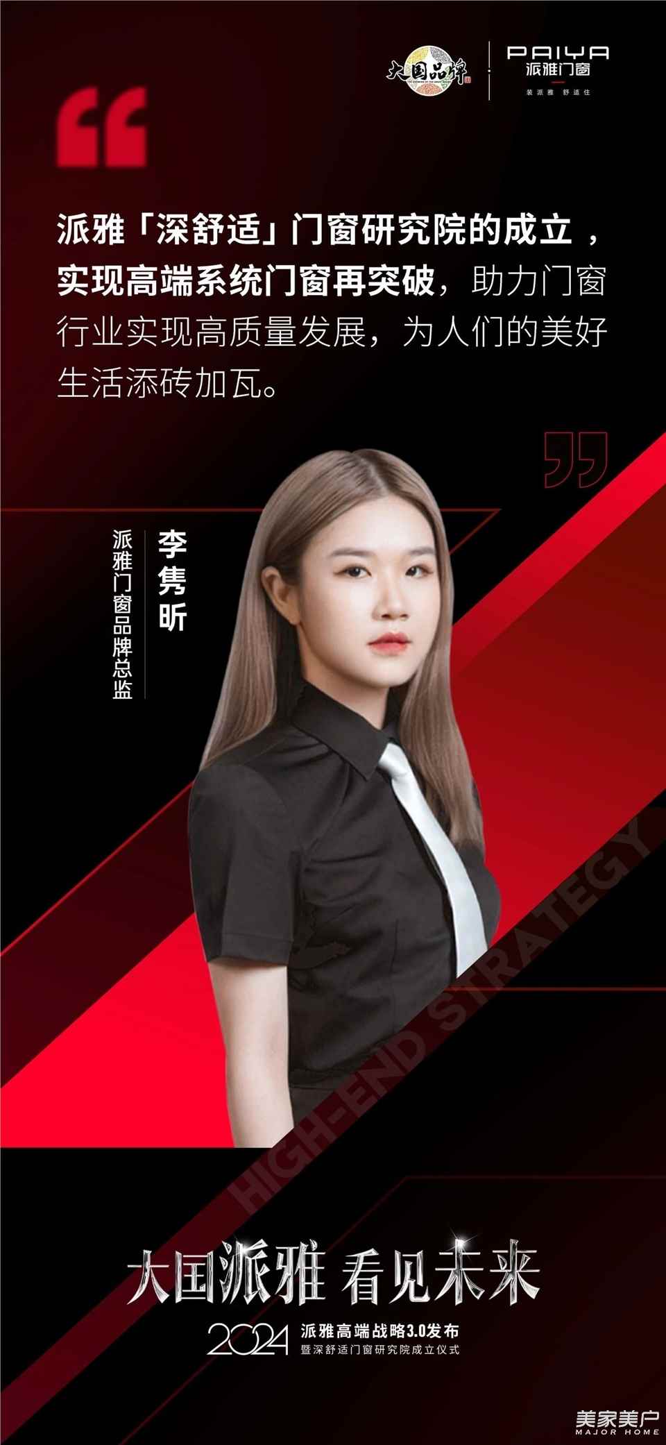 峰会现场,派雅「深舒适」门窗研究院正式成立,派雅门窗品牌总监李隽昕解读“「深舒适」门窗研究院”并明确指出,「深舒适」门窗研究院的成立,是基于不断了解用户生活方式以及对系统门窗产品的需求,以「深舒适」品牌定位战略,实现高端系统门窗再突破的举措。