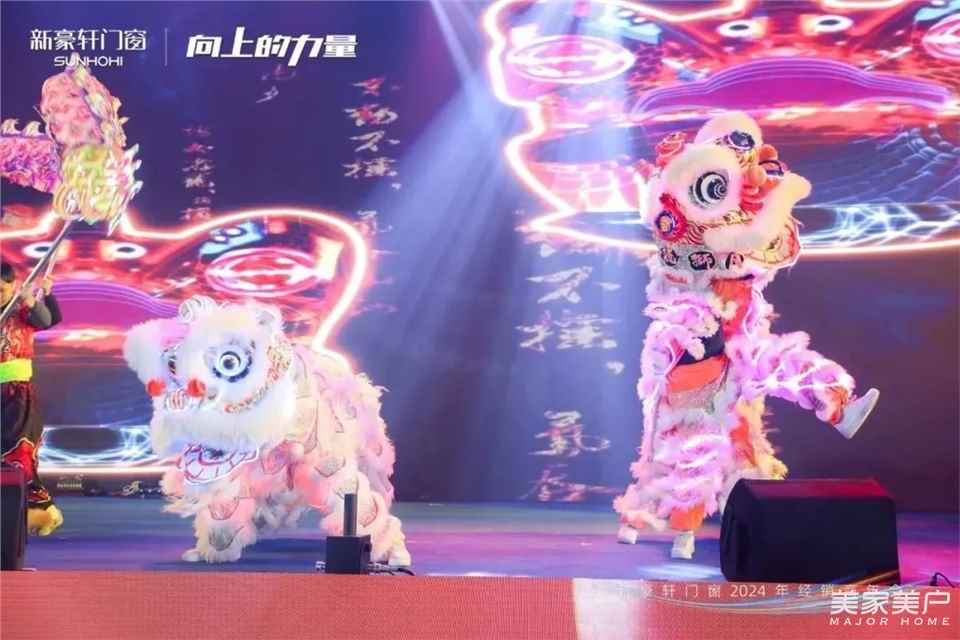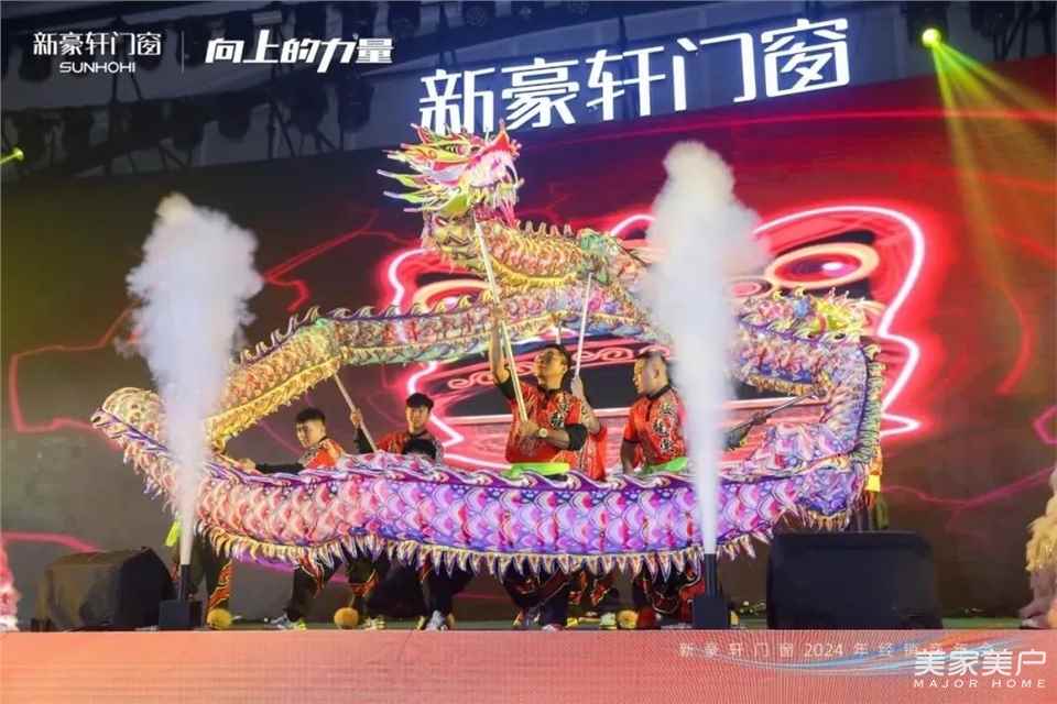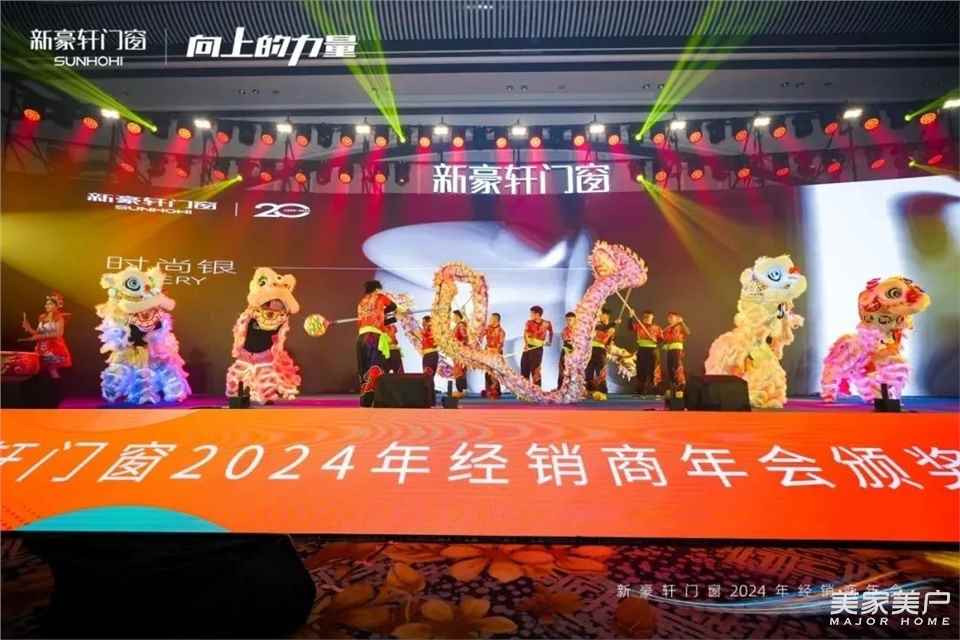 在悠扬的音乐声中,新豪轩门窗千人家宴在晚上6点正式开宴。五湖四海的经销商在龙年齐聚一堂,举杯庆祝欢乐的时光。舞台上的醒狮与腾龙,预示着全体新豪轩人在2024年龙行大运、生意兴隆。