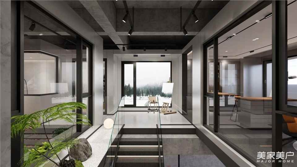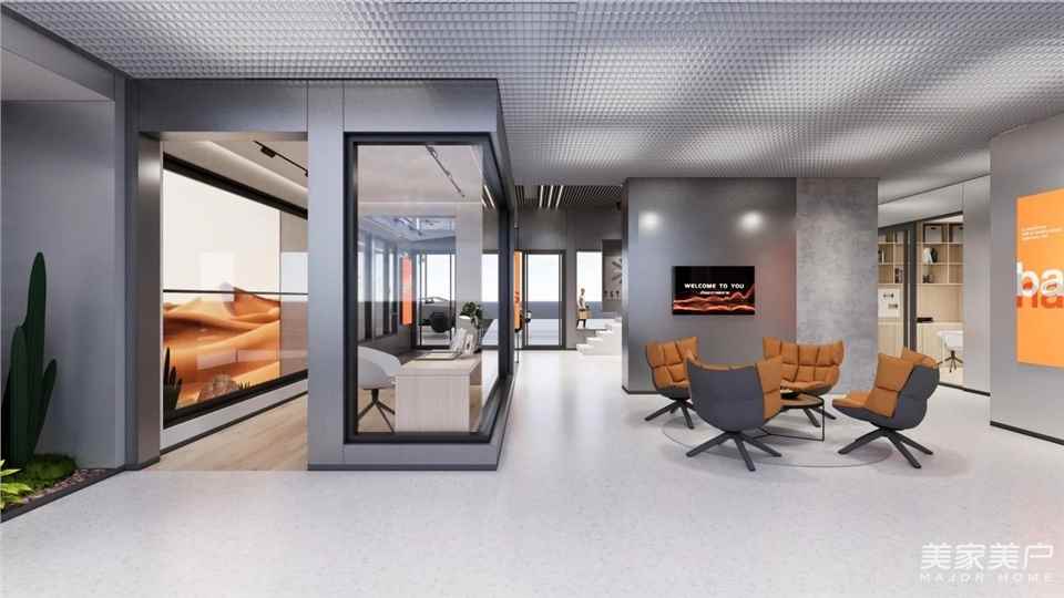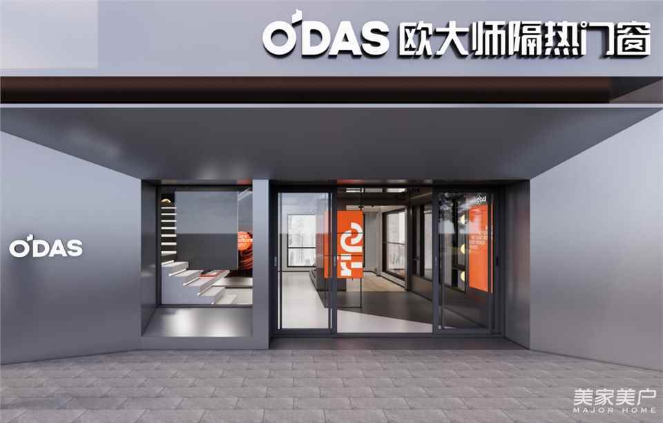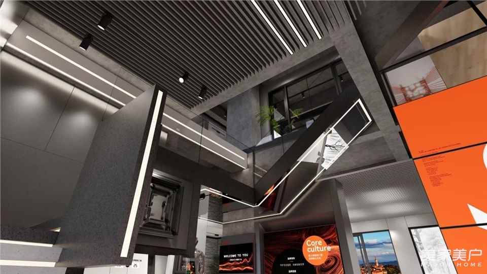 两层中空开放式的空间构造,更显空间感与建筑立体感。在具有更高可利用率的前提下,进行品牌调性色彩的运用、工法区的科技感、产品展示与场景设置。以实现技术、艺术与生活的和谐统一,彰显欧大师隔热门窗的美学理念。