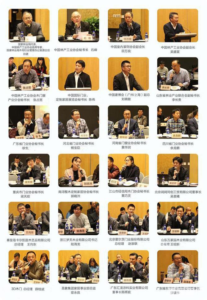 国家林业局代表、中国林产工业协会首席专家、国家林业局木材行业管理办公室原主任孙建,中国林产工业协会秘书长石峰,中国室内装装饰协会副会长田万良,中国林产工业协会副会长吴盛富,中国林产工业协会木门窗产业分会秘书长张占宽,中国国际门业、定制家居展览会秘书长陈伟,中国林产工业协会驻广东办事处马云飞,中国建博会(广州/上海)副总刘晓敏,山东省林业产业联合会副秘书长李长贵,广东省门业协会秘书长徐生、副秘书长王生华,河北省门业协会秘书长杨宝臣,河南省门窗业协会秘书长黄华润,四川省门业协会秘书长余龙鹏,浙江省门业协会秘书长李进,陕西省门业协会会长陈玉霖,辽宁省家具协会木门专委会秘书长马金亮,重庆市门业协会秘书长梁天顺,南浔整木定制家居协会秘书长郭晓沛,江山市经信局木门协会秘书长黄巧灵,江山市林业局秘书长郑进,黑龙江省伊春市林产工业局局长王刚,以及北京闼闼同创工贸有限公司董事长吴晨曦、董事长助理张岩,秦皇岛卡尔凯旋木艺品有限公司总经理王向东,浙江梦天木业有限公司书记陆海龙,广东汇龙涂料实业有限公司董事长陈辉庭,广东耀东华木业有限公司董事长曾敏华,北京霍尔茨门业股份有限公司总经理赵崇联,山东万家园木业有限公司总经理王绍新,河南永威安防股份有限公司董事长任太平,3D木门总经理薛桂斌,圣象集团家居事业部总监宦永良,重庆豪迈家具制造公司总经理谢江平,重庆星星套装门有限公司董事长助理杨军,河北鑫鑫木业有限公司总助郑九腾,河北鑫鑫木业有限公司市场部总监贺文献,山东鑫迪家居装饰有限公司运营部总监孔鹏,广东美涂士建材股份有限公司家具漆事业部总经理陈祯荣等木门窗行业协会及企业相关负责人近50人出席了此次会议。