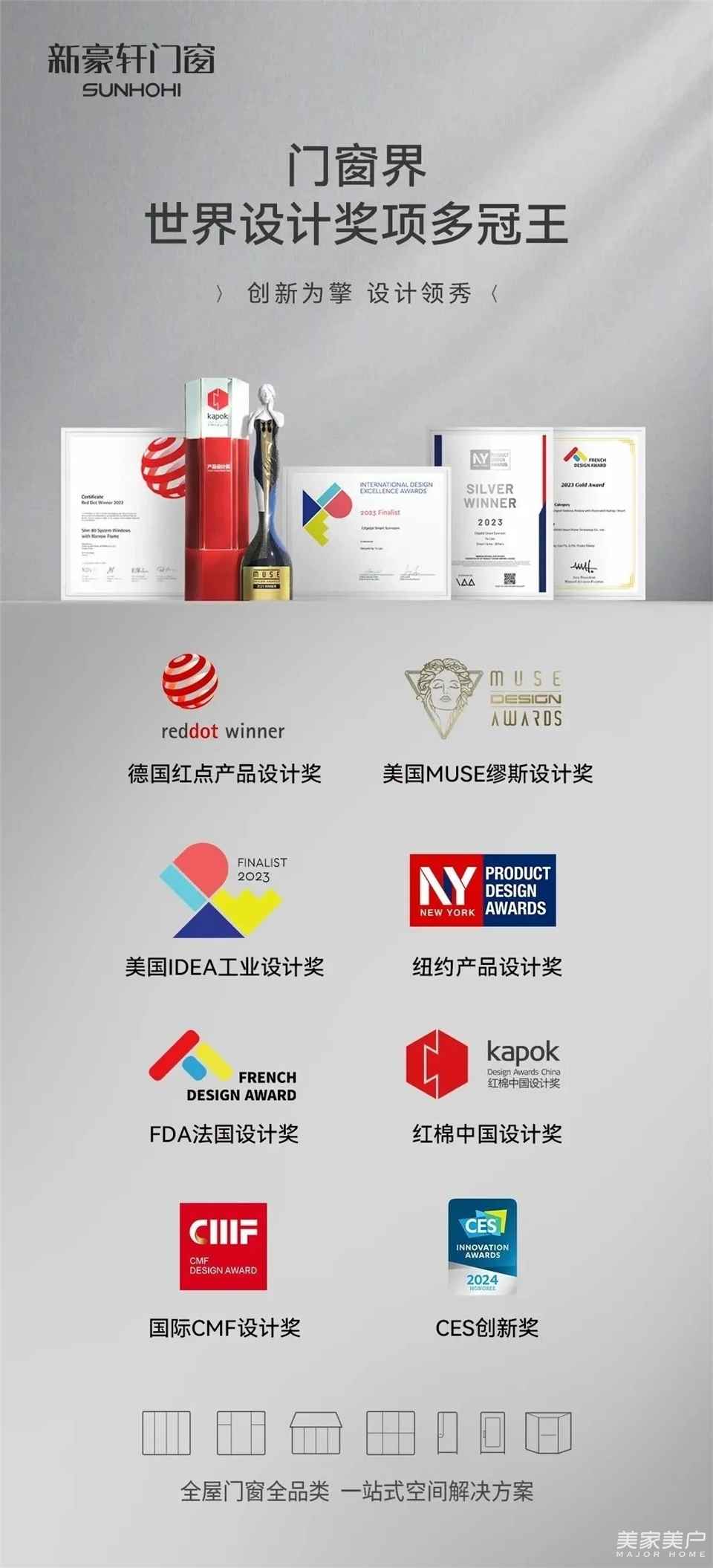 在过去三年里,新豪轩门窗荣获多项国际大奖,如德国红点产品奖(被誉为工业界的奥斯卡奖)、纽约产品设计大奖以及美国缪斯设计奖等,成为门窗行业首家连续多年同时获得多项国际荣誉的企业。在2023年,新豪轩还荣获广东省专精特型企业的称号,并成为佛山市前三家、南海区首家工业设计中心。