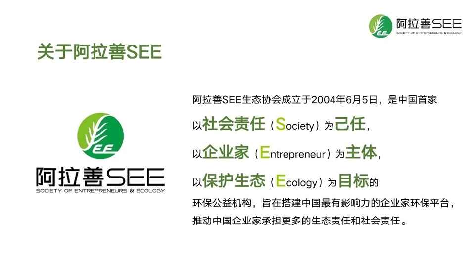 阿拉善SEE生态协会成立于2004年,由近百名企业家在内蒙古阿拉善腾格里沙漠发起。是中国首家以社会责任(Society)为己任,以企业家(Entrepreneur)为主体,以保护生态(Ecology)为目标的社会团体。