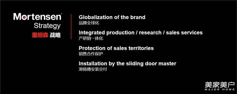 墨坦森形成了“品牌全球化、产研销一体化、销售合作保护、滑师傅安装交付”四大品牌战略,提供完美的产品和服务组合,确保合作伙伴的成功与客户的满意。