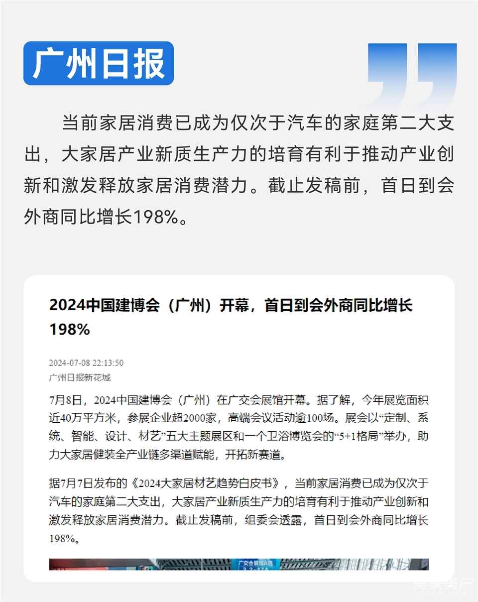 由中国对外贸易中心集团有限公司、中国建筑装饰协会主办,中国林产工业协会、全国工商联家具装饰业商会支持的第26届中国建博会(广州)于7月11日圆满落下帷幕。由中国对外贸易广州展览有限公司和红星美凯龙家居集团股份有限公司主办的2024广州卫博会同期闭幕。
