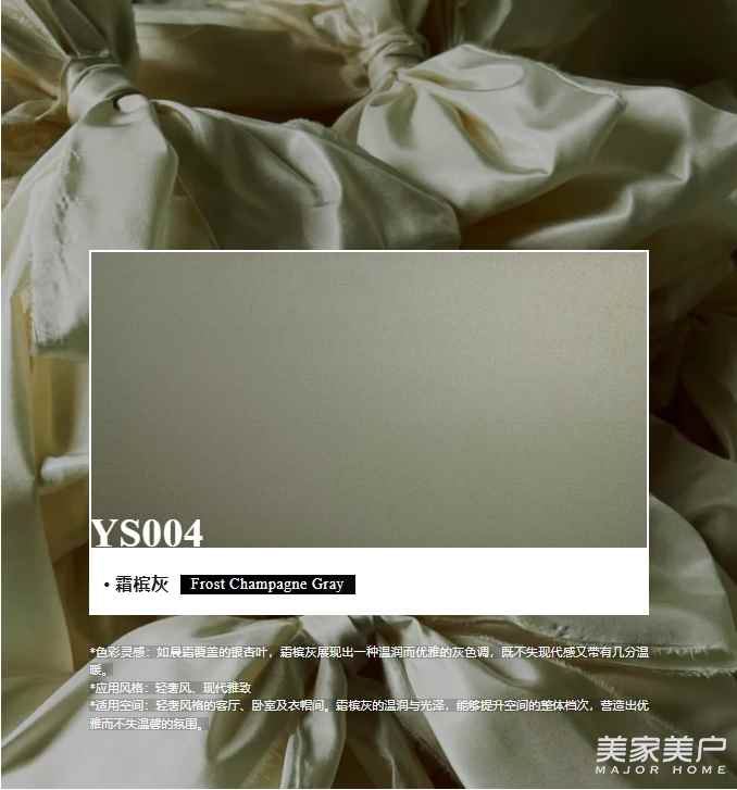 *适用空间:轻奢风格的客厅、卧室及衣帽间。霜槟灰的温润与光泽,能够提升空间的整体档次,营造出优雅而不失温馨的氛围。