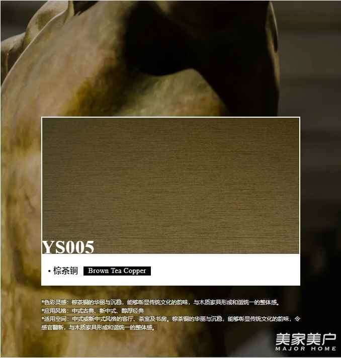 *色彩灵感:棕茶铜的华丽与沉稳,能够彰显传统文化的韵味,与木质家具形成和谐统一的整体感。