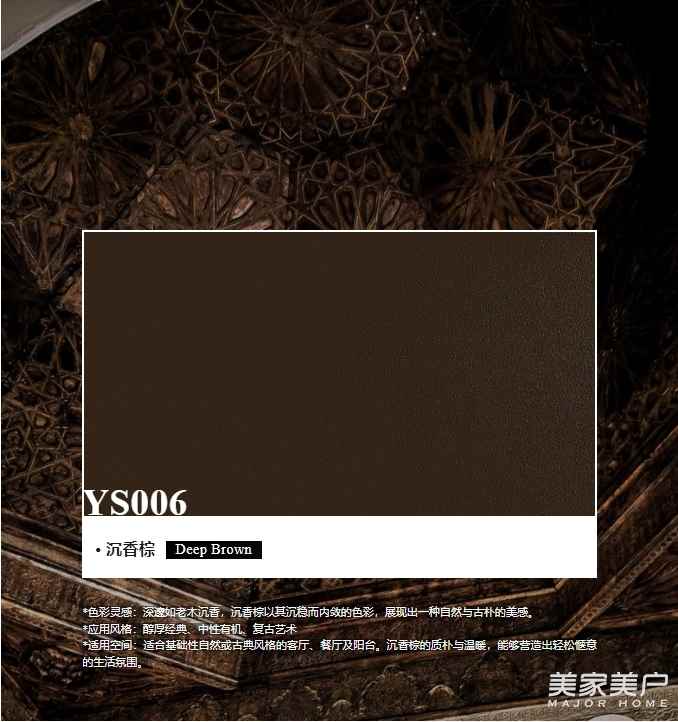 *适用空间:适合基础性自然或古典风格的客厅、餐厅及阳台。沉香棕的质朴与温暖,能够营造出轻松惬意的生活氛围。