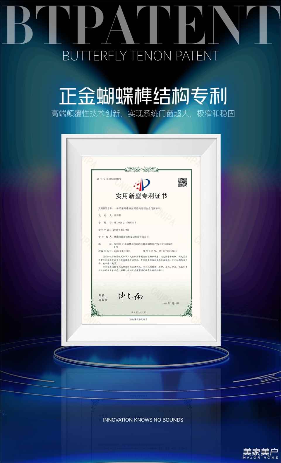 为了给消费者带来更高端安全的家居理想生活方式,正金门窗经过多年的技术积累和突破,荣获「BTPatent - Butterfly Tenon Patent」权威专利证书,以技术赋能,引领行业品质发展之路,以研发驱动,助力产品创新升级。再次彰显了正金门窗在行业内的领先地位与品牌实力。
