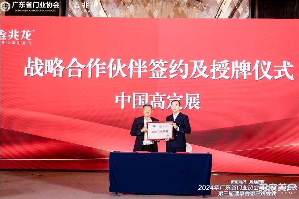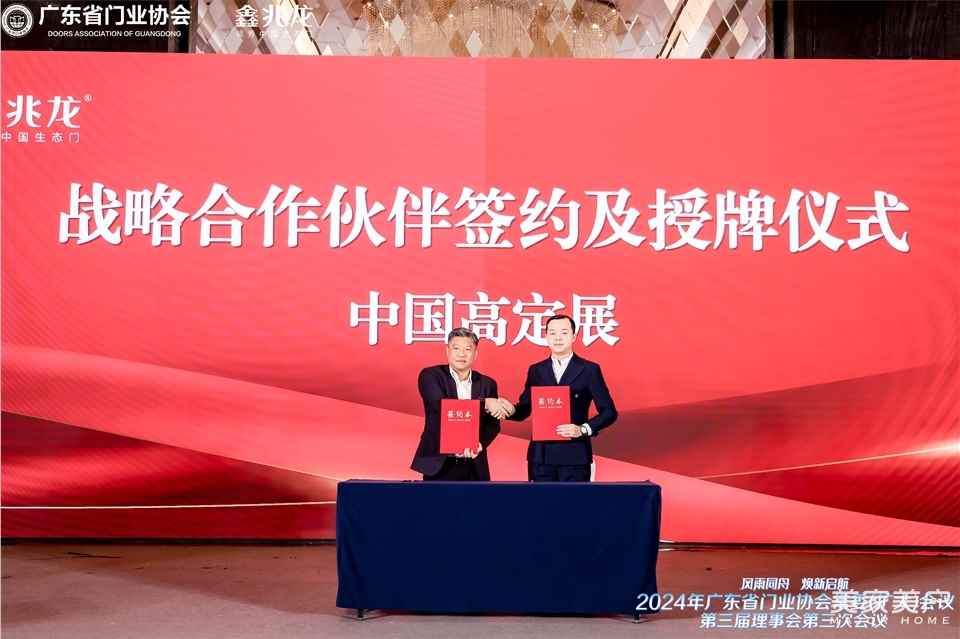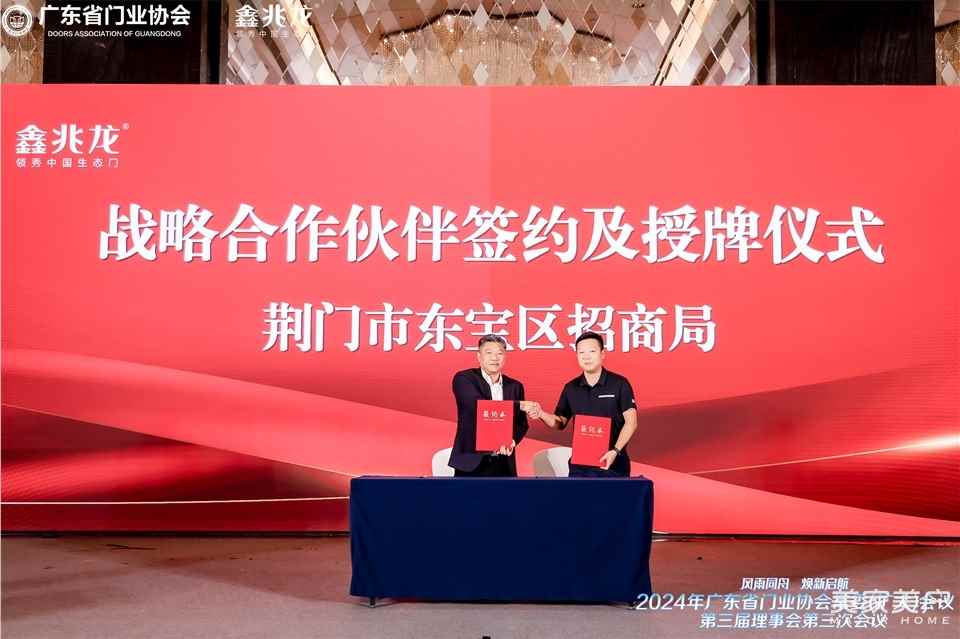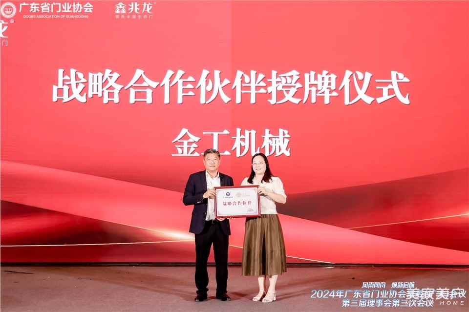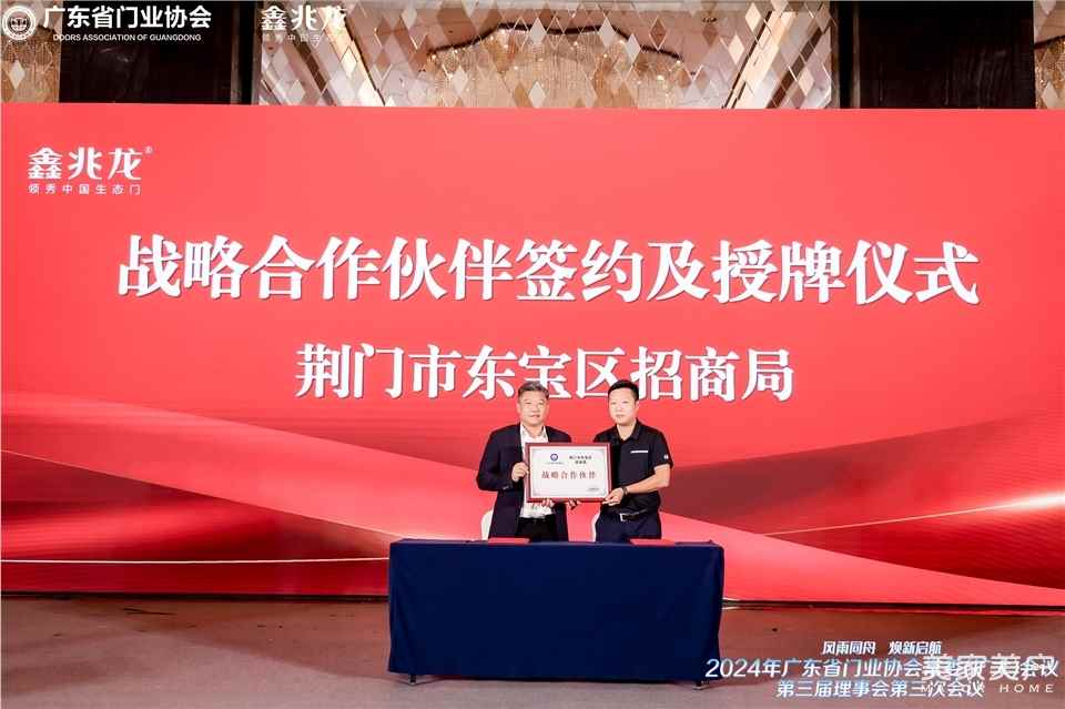 晚宴现场还举办了隆重的战略合作伙伴签约及授牌仪式仪式。广东省门业协会分别与荆门市东宝区招商局、中国高定展签署战略合作协议,并为荆门市东宝区招商局、中国高定展、金工机械三家企业颁发了战略合作伙伴荣誉牌。