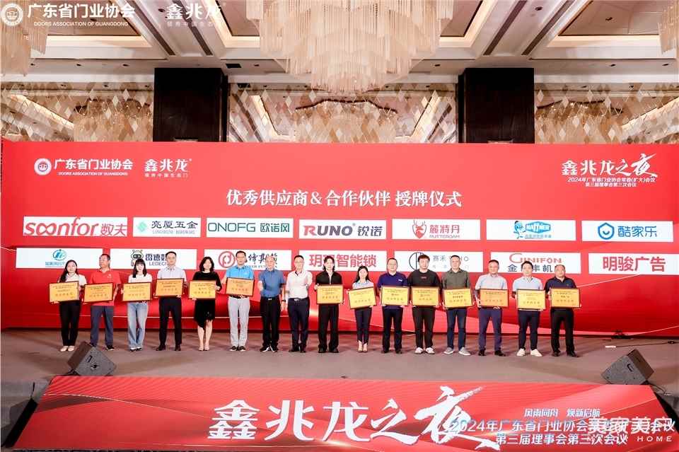 为表彰门窗产业链企业为推动门窗行业发展所做出的贡献,协会分别向荣获“金牌供应商”:鑫兆龙铝业,以及“合作伙伴”:先锋期货,“优秀供应商”:数夫软件、亮厦五金、欧诺风、锐诺、麓特丹、酷家乐、海富纳智能装备、俊美琪粉末涂料、雷德数控、玥玛智能锁、赛禾、金利丰机械、明骏广告颁发了荣誉牌。