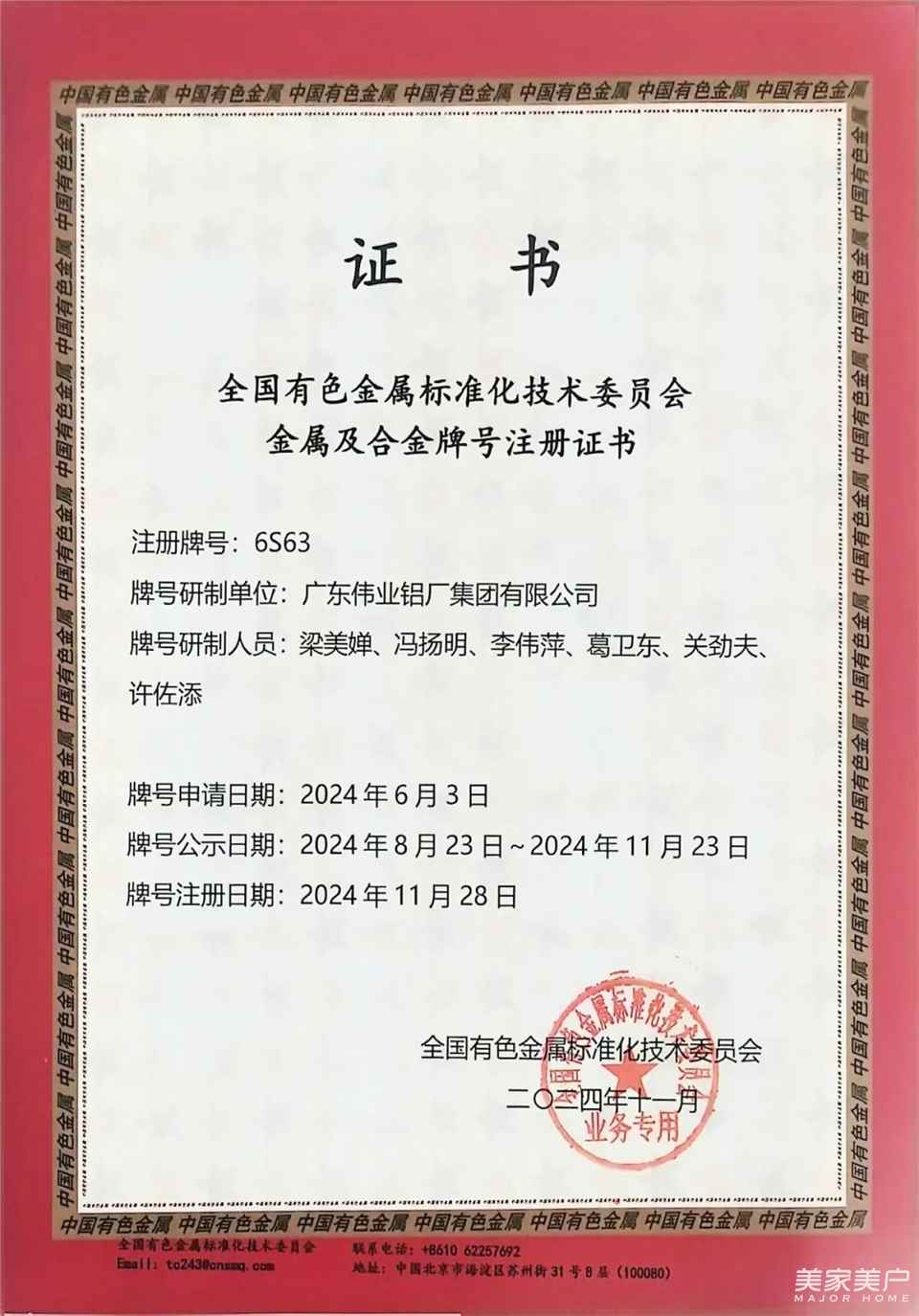 近日,由伟业自主研发的高性能铝合金材料,成功荣获中国有色金属标准化技术委员会颁发的金属及合金牌号注册证书,正式注册为6S63牌号。这是伟业铝材继成功注册6E05铝合金牌号后,在高强韧铝合金新材料领域取得的又一重要突破。此举奠定了伟业铝材在发展“创新伟业”、“科技伟业”方面的坚定信心和决心,以及在扩大铝应用方面强大的持续创新能力。