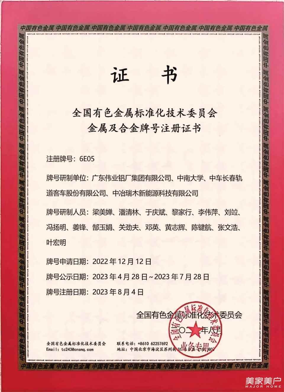伟业铝材两个新合金牌号6S63、6E05成功注册