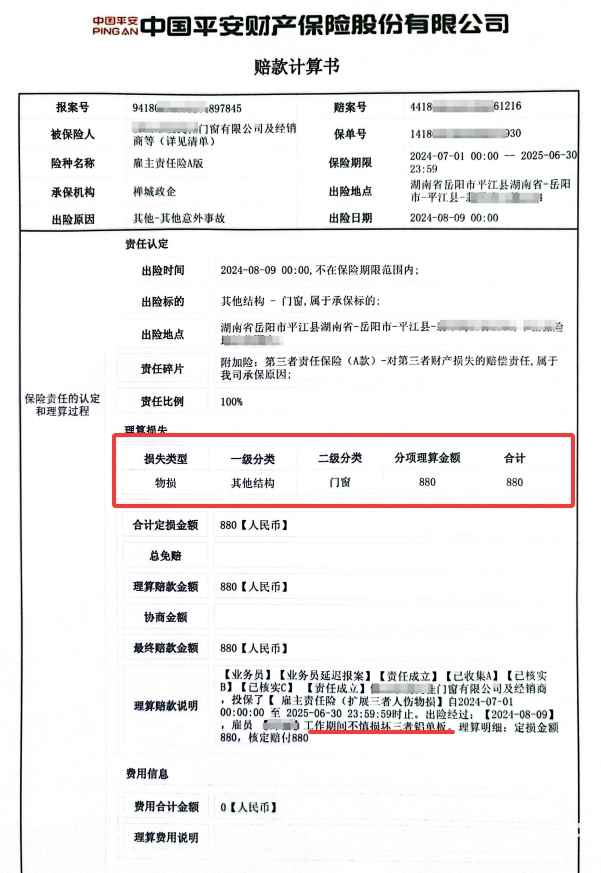 出险原因:门窗安装时,不慎损坏楼下阳光棚玻璃。