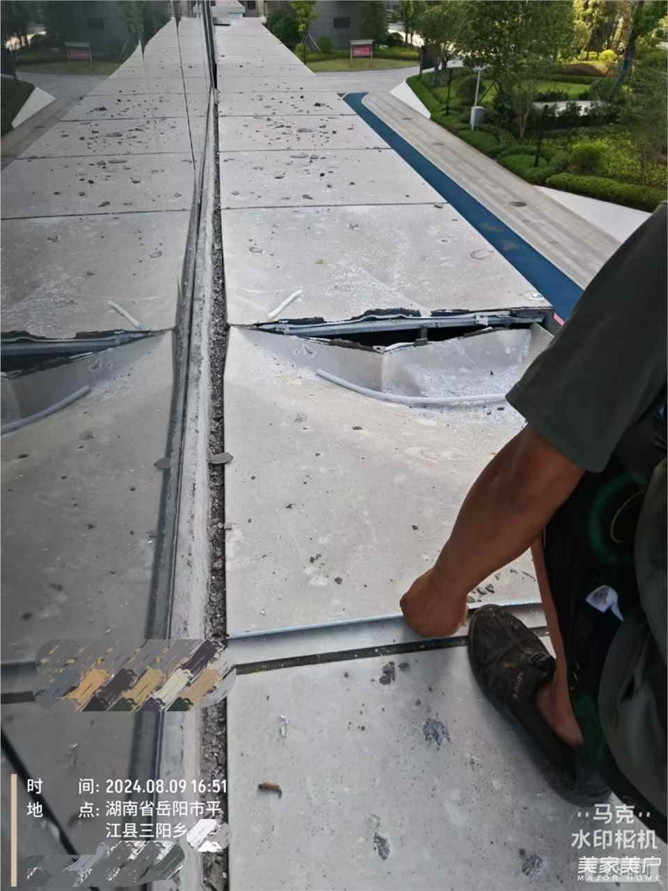 出险原因:门窗安装时,不慎掉落工具,砸坏小区外墙铝制饰板。