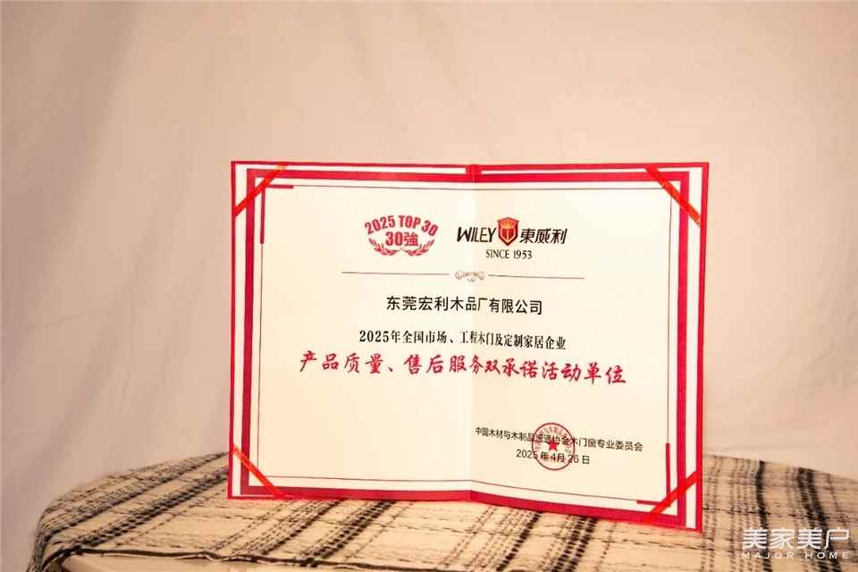 东威利在此次年会荣获2025年全国市场、工程木门及定制家居企业产品质量、售后服务双承诺活动单位殊荣!