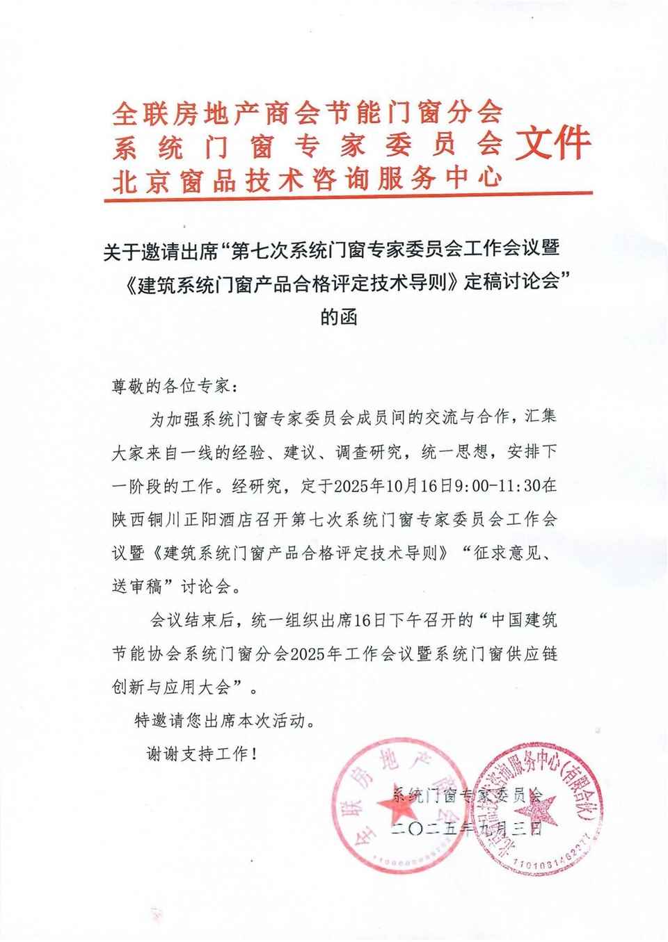 关于邀请出席“第七次系统门窗专家委员会工作会议”的函