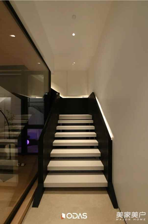 抵达楼梯尽头的转角,眼前这条通透的走廊,便是二层 “空中阁楼” 的序章。脚下与身旁的材质:不再是一层温润的原木与粗犷的石材,取而代之的是带有细腻光泽的金属线条、清透的玻璃与精密板材。