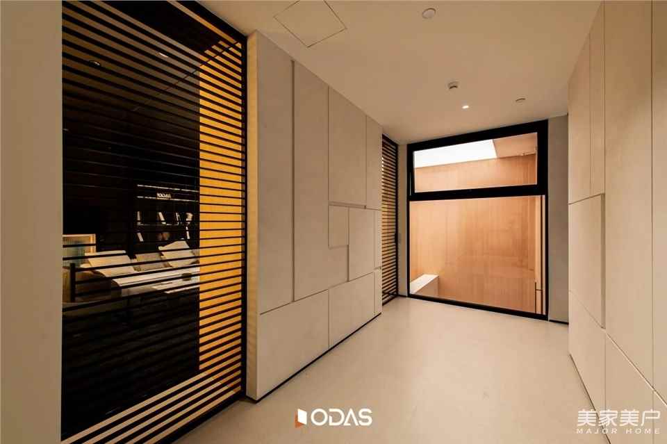 顶部的天光系统会随着外界天色变化调整亮度,两侧墙面的侧光与点状射灯则巧妙藏在原木格栅后,光线透过格栅的缝隙洒下来,再经过身旁门窗的玻璃折射,在地面、墙面形成斑驳流动的光影。光不仅把原木的肌理、石材的质感雕琢得更有层次,更让整个空间“活”了起来。