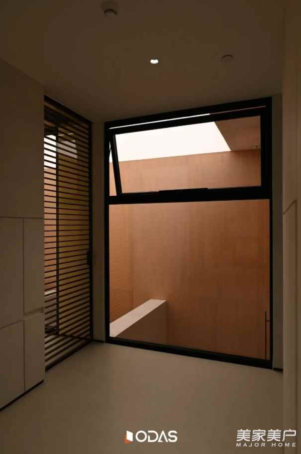 更为精妙的是,它与墙面的白色肌理分格形成了完美呼应:墙面肌理线条规整有序,尽显现代设计的利落之感;而敞开的上悬窗则似为这份利落注入了一丝灵动。窗外是一层峡谷的自然光影,窗内是现代质感的空间,一窗之隔,自然与精致达成了奇妙的平衡。