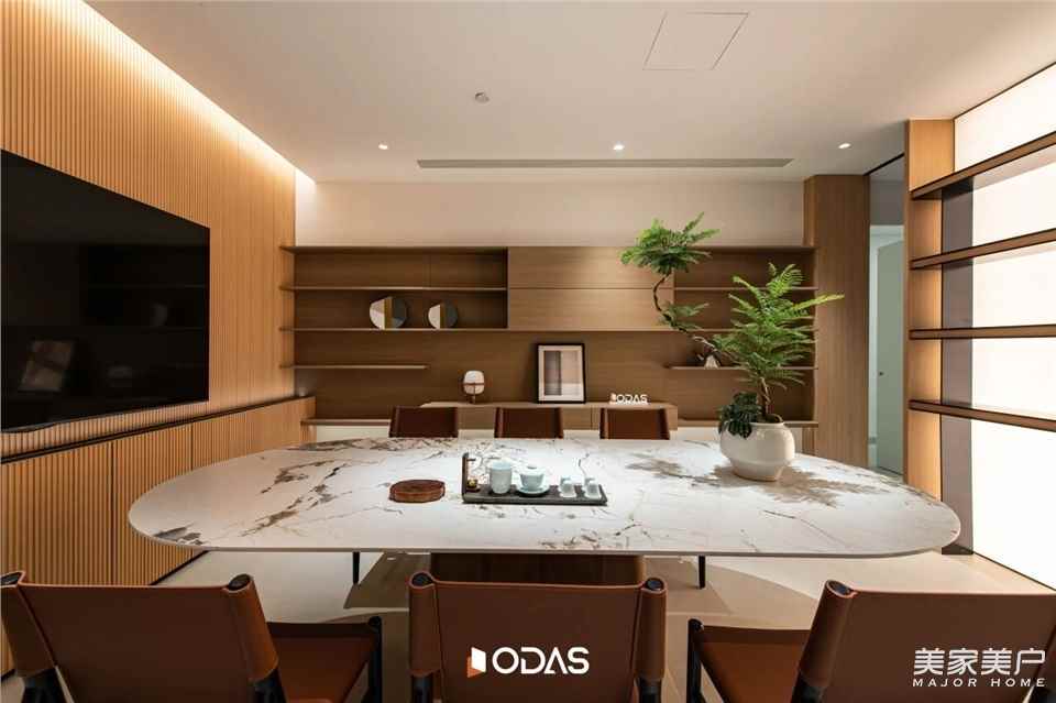 在欧大师泉州健康人居艺术馆的「洽谈体验区」,结合商务会议、VIP洽谈、休闲茶室等体验功能。洽谈区是整个自然峡谷的“核心”,一个被清透玻璃和原始石材包裹的沉思之所。