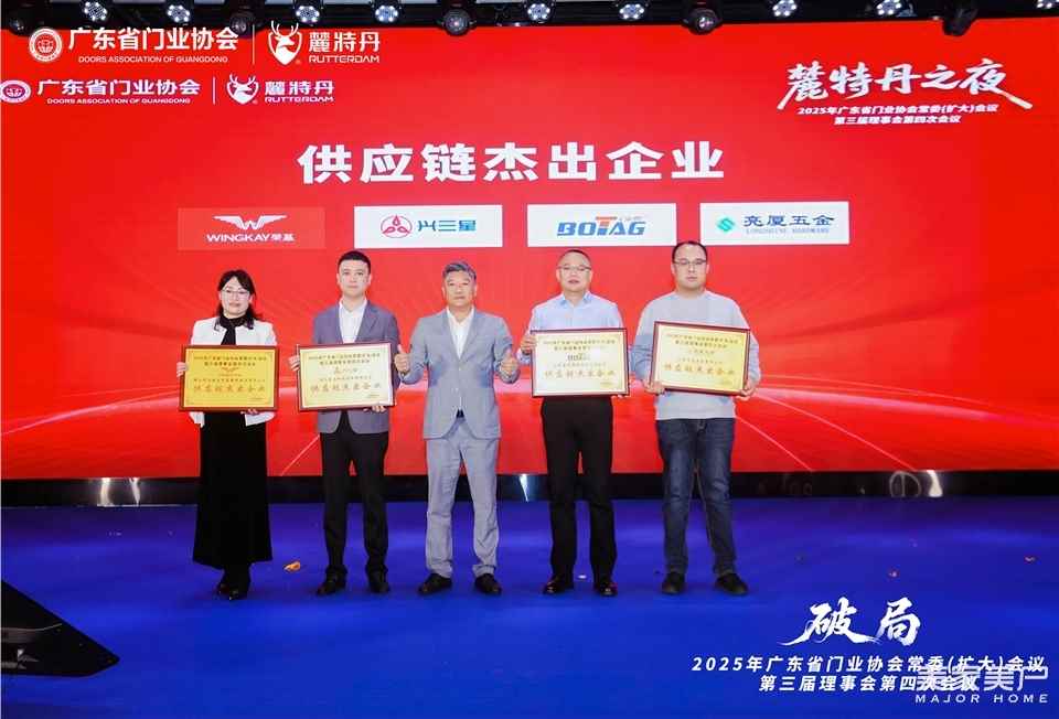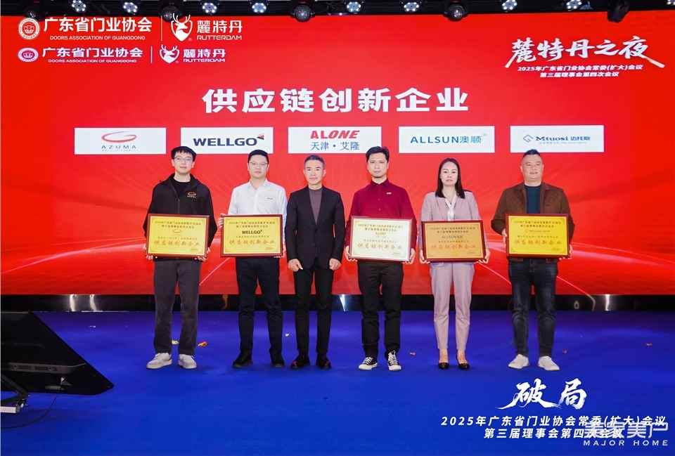 麓特丹被授予“卓越贡献企业”称号,小德智能获评“智能门窗创新企业”,荣基、兴三星、宝泰、亮厦荣获“供应链杰出企业”称号,澳思万检测、威固、天津·新艾隆、澳顺、迈托斯门窗五金摘得“供应链创新企业”殊荣。