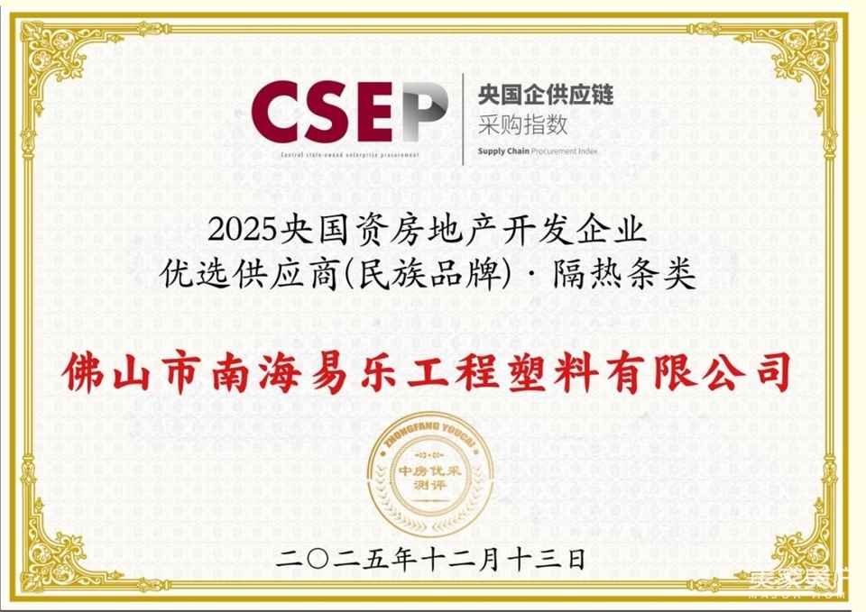 近日,在 “精筑匠心好房 优采新质好材” 供应链合作大会北京站上,白云易乐(佛山市南海易乐工程塑料有限公司)荣耀入选《2025 央国资房地产开发企业优选供应商(民族品牌)研究报告》“隔热条类” 优选供应商!