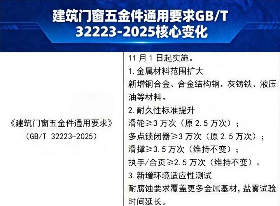 2025 年 11 月 1 日,《建筑门窗五金件通用要求》(GB/T 32223-2025)正式实施,这一标准的更新,标志着门窗五金行业从 “功能适配” 向 “长寿命、高适配” 的品质升级迈进,也与此前《住宅项目规范》中 “外窗设计工作年限≥25 年” 的要求形成联动,倒逼全产业链提升产品耐久性与合规性”。
