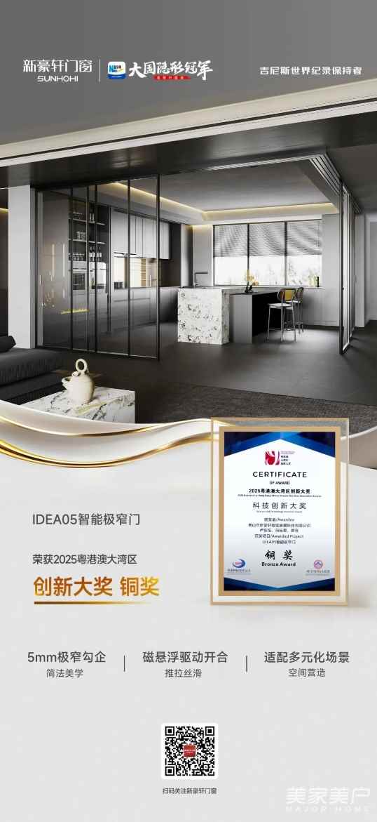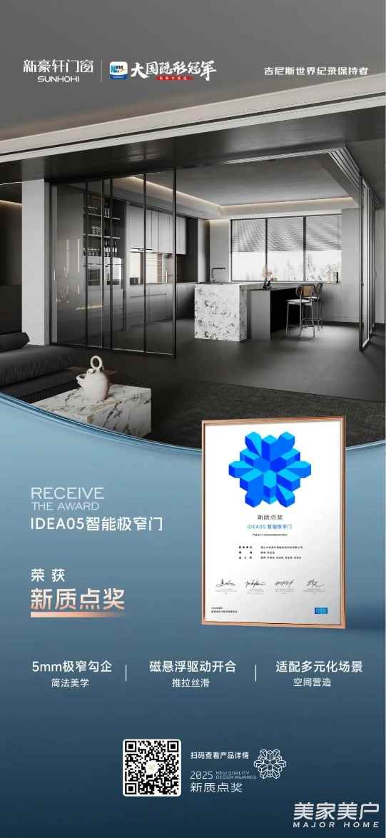 经过由25位国内外顶尖专家组成的评审团多轮严苛评审,新豪轩门窗IDEA05 PRO智能极窄门凭借卓越设计,从逾万件作品中脱颖而出,成功晋级仅312件作品的终评环节,并最终斩获“产品设计奖”,奖项含金量不言而喻。