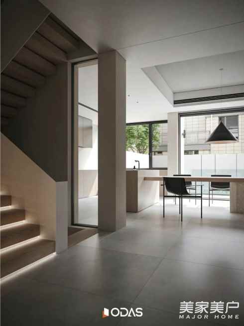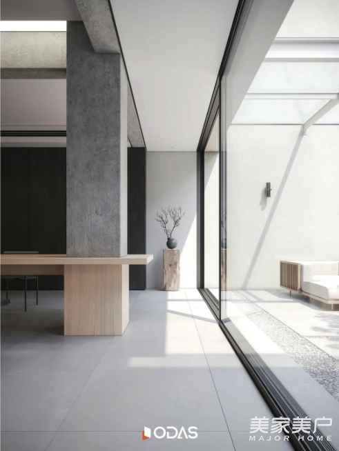 光,引出了景;而景,则需要无界的承载。连接下沉庭院与室内空间的,是欧大师焕境150全景推拉门。以极简语言,实现室内与庭院的无界连通,视野得以无限延伸;其3.5cm超低预埋轨道实现视觉上的“零障碍”,让室内外景观连贯如画;单滑轮高承重能力满足高频使用需求,确保超大玻璃门扇推拉顺滑静音。