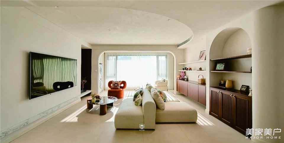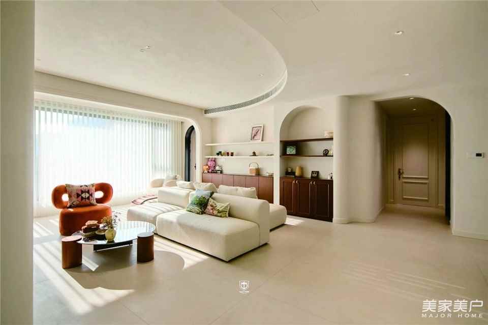 阳光漫过弧形轮廓,在米白沙发上晕开一层暖光,无声诉说:家,本就该是包容、松弛、治愈的模样。