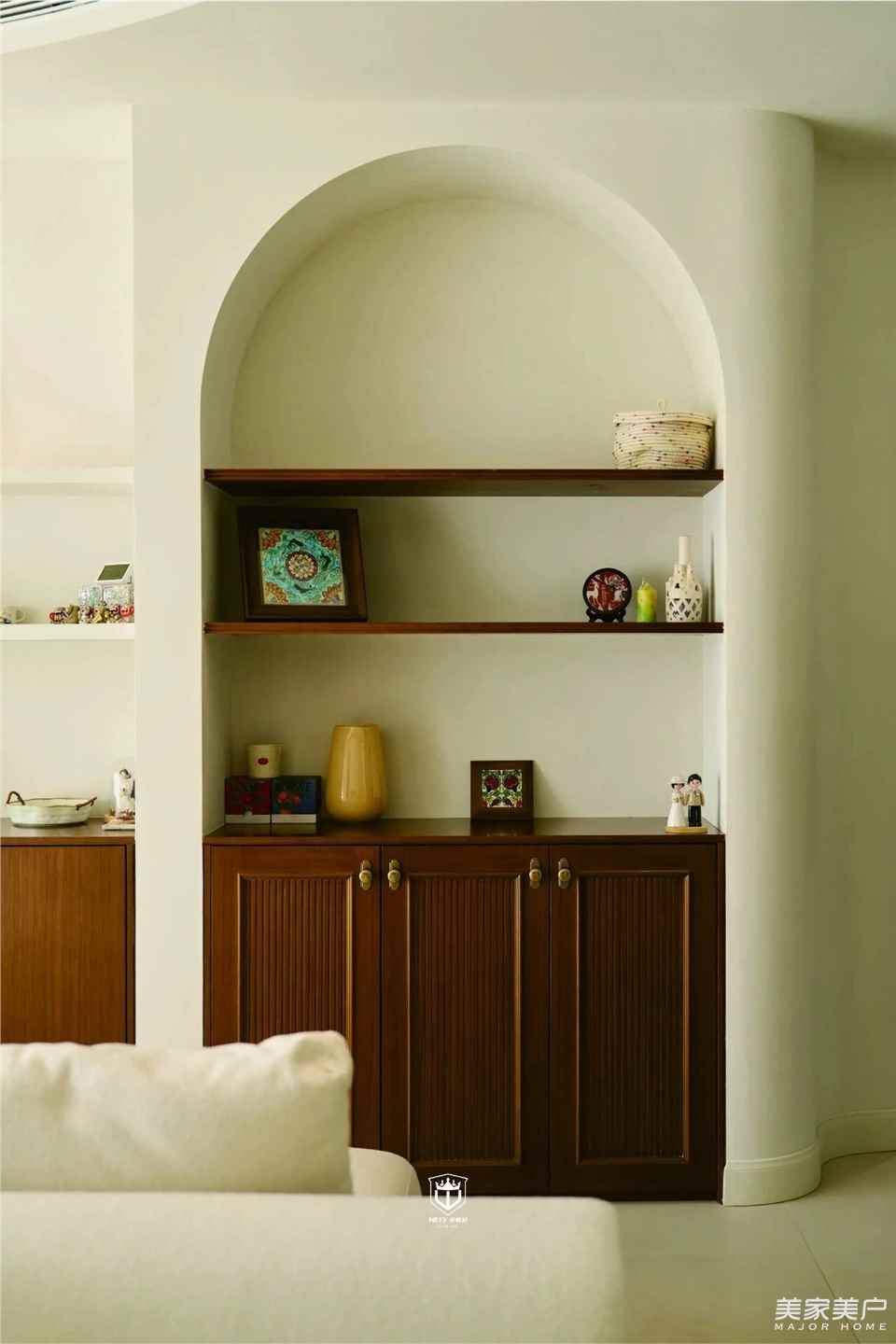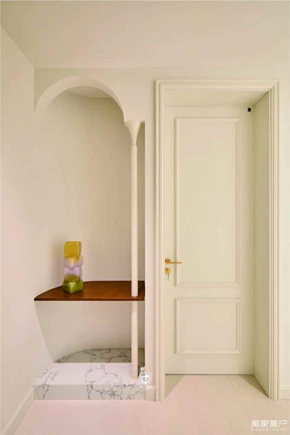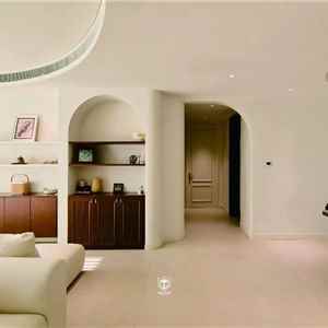 弧形是空间最温柔的笔触。从流畅的弧形天花,到圆润的垭口拱顶,再到墙面的半弧壁龛,每一道曲线都在消解生硬,让光与风循着温柔轨迹自在流淌。