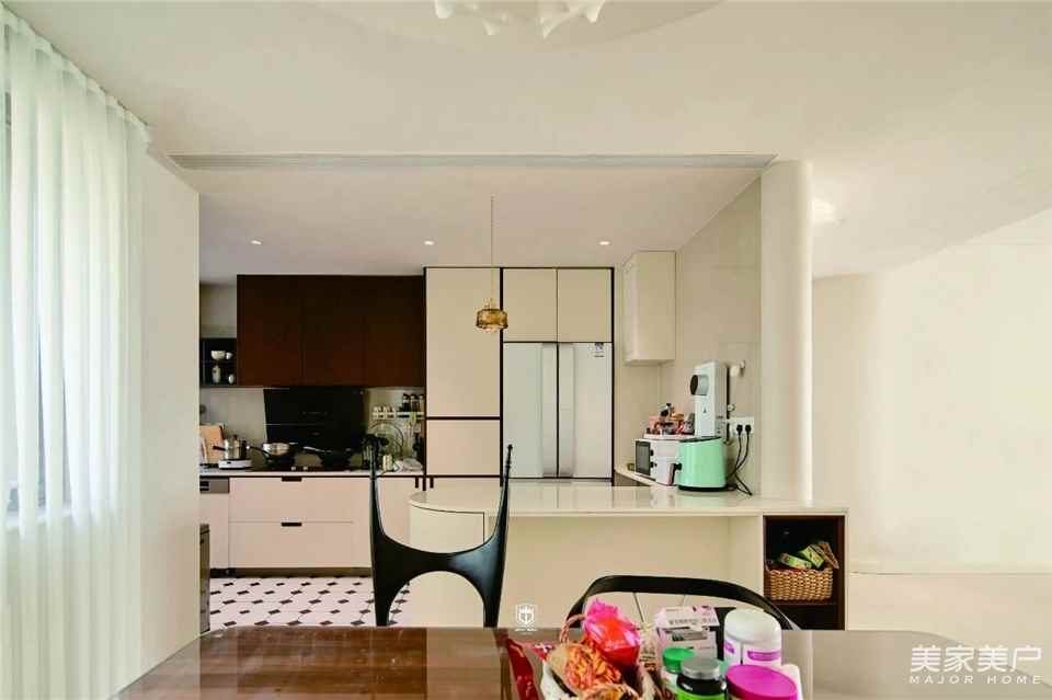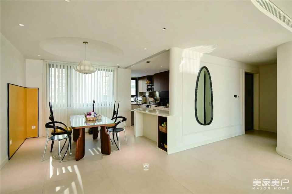 餐厨一体通透布局,让烟火与日光自然相拥。玻璃餐桌承载三餐四季,波浪木腿藏着细腻巧思;开放式中岛衔接厨房,备餐、闲谈、分享美味,一步之间皆是温情。