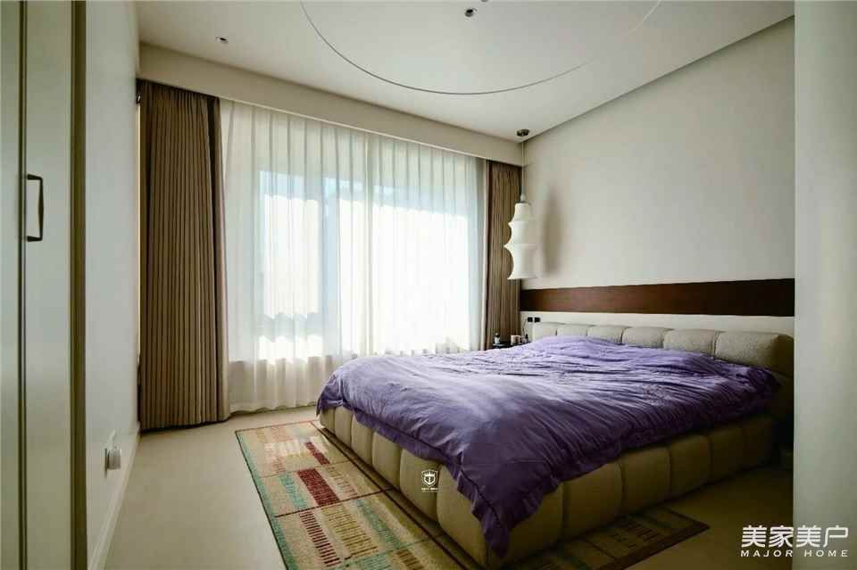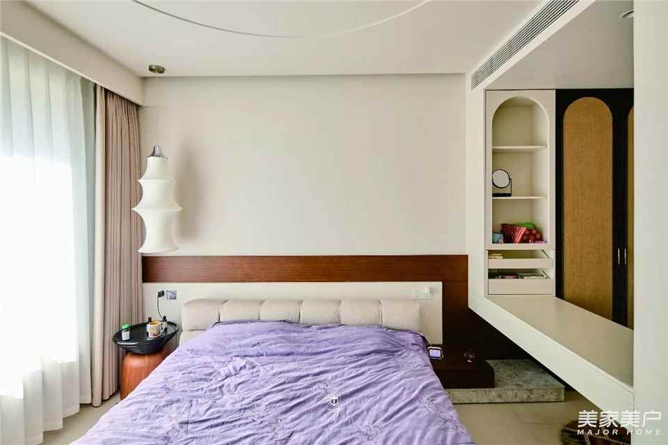 日光轻透纱帘,为奶白空间铺满温柔底色;弧形壁龛与圆润立柱彼此呼应,空间过渡灵动自然;弧形吊顶圈住一室安宁,让睡眠成为一场温柔的疗愈。