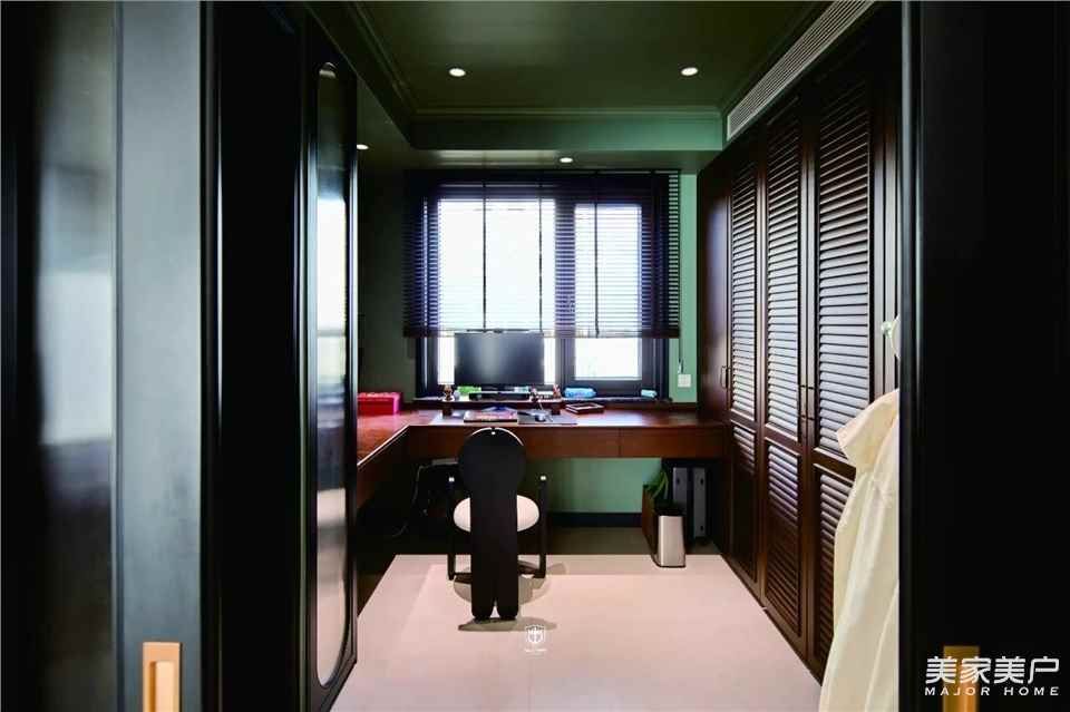 推门而入,墨绿墙顶包裹静谧,深棕木桌安放思绪,百叶帘滤下的细碎光影落在桌面。这里既是灵感生长的书房,也是收纳生活美好的衣帽间,藏着独属于自己的松弛与自在。